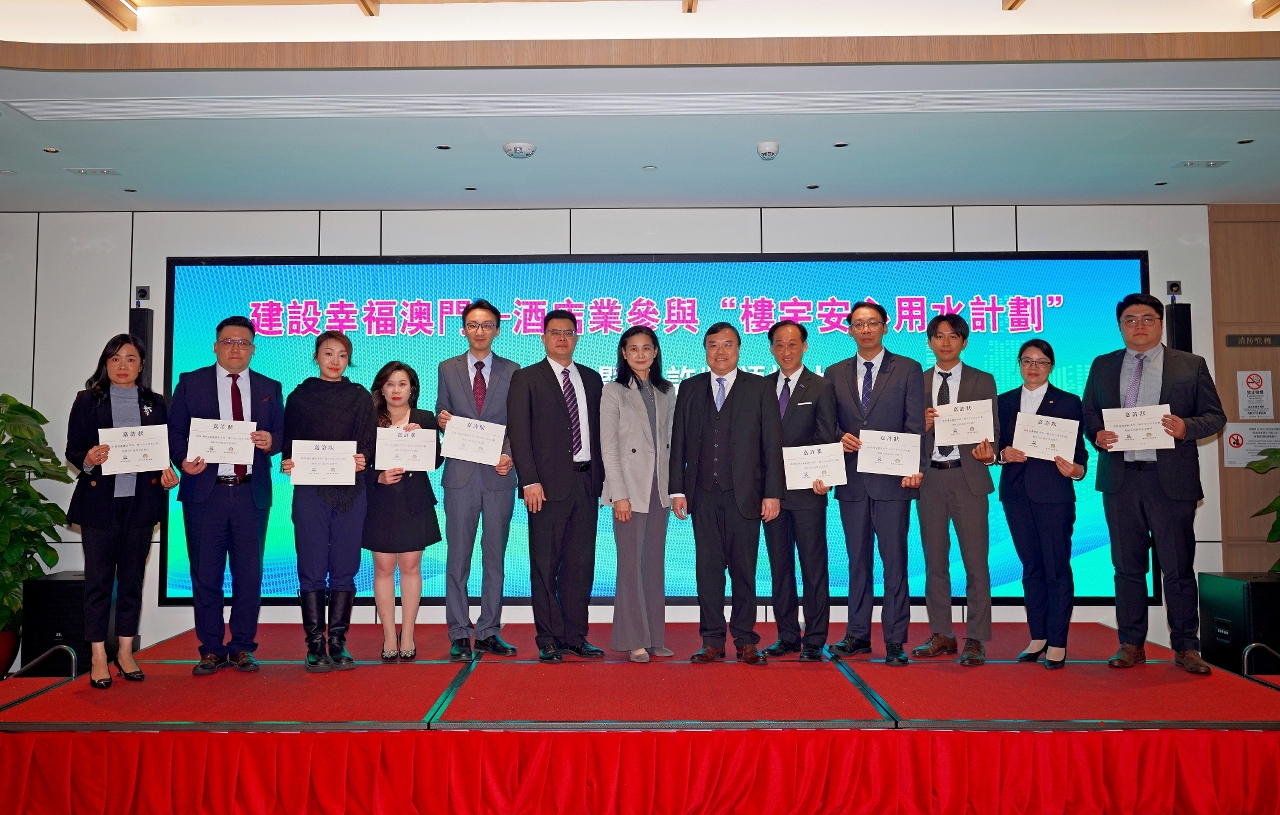 为鼓励本澳酒店业界参与“楼宇安心用水计划”,海事及水务局与澳门酒店旅业商会于3月17日(周一)下午3时合办「建设幸福澳门—酒店业参与“楼宇安心用水计划”动员仪式暨嘉许状颁授大会」,十间参与“楼宇安心用水计划”的会员酒店获颁发嘉许状。