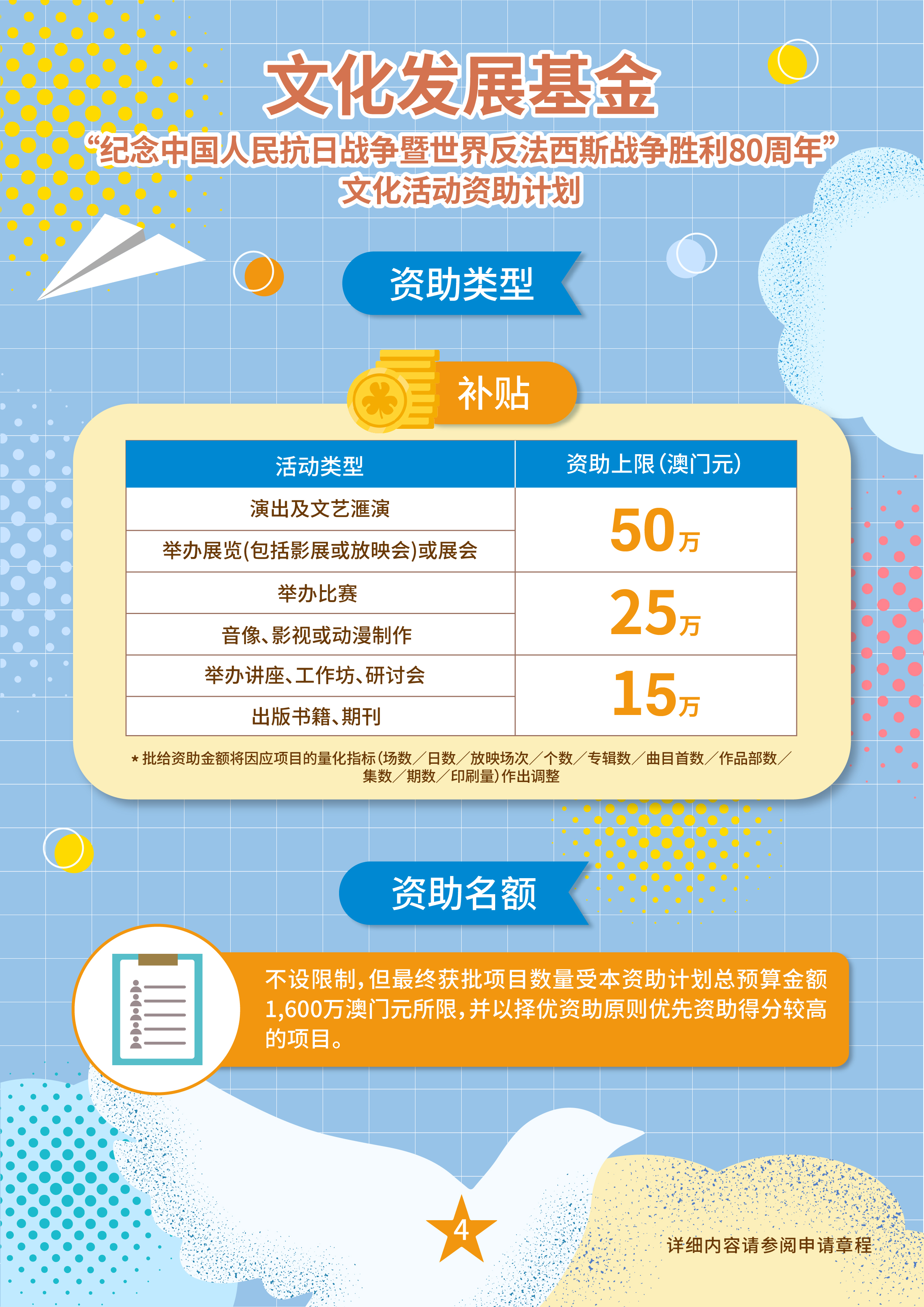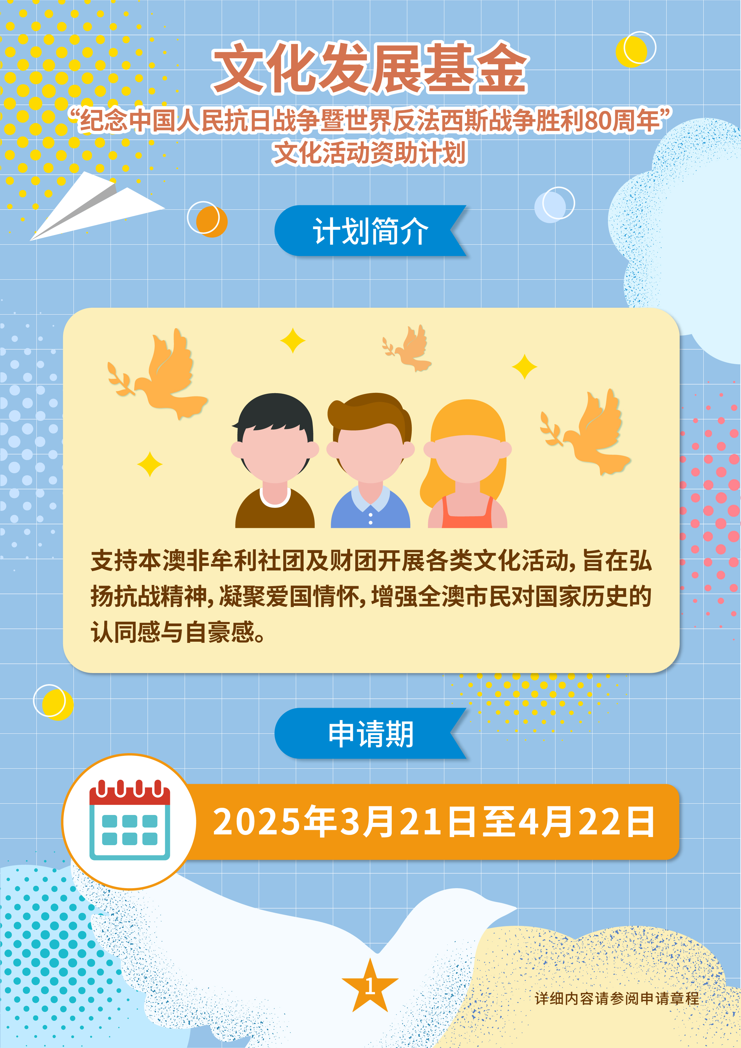 为纪念中国人民抗日战争暨世界反法西斯战争胜利80周年,文化发展基金推出“纪念中国人民抗日战争暨世界反法西斯战争胜利80周年”文化活动资助计划,支持本澳非牟利社团及财团开展各类文化活动,旨在弘扬抗战精神,凝聚爱国情怀,增强全澳市民对国家历史的认同感与自豪感。