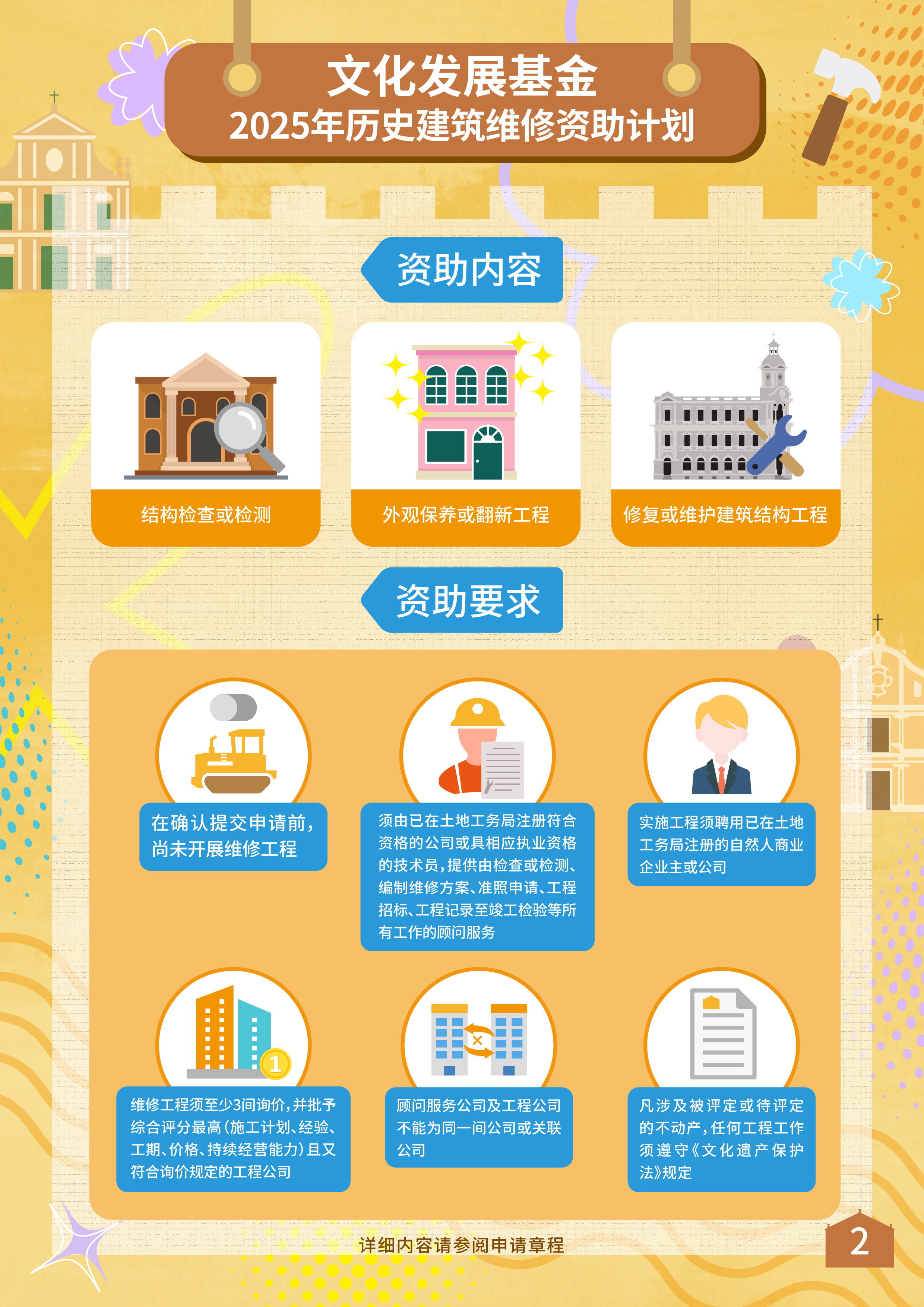 “历史建筑维修资助计划”今年将推出两轮申请,第一轮申请期由2025年3月31日至5月30日,第二轮申请期则由9月15日至11月14日。资助范围包括在申请期开始前尚未开展维修工程的被评定、待评定的不动产及具文化价值的不动产,并须由不动产的业权人或获授权人提交申请,如业权由多人拥有,可由任一共有人提交申请。