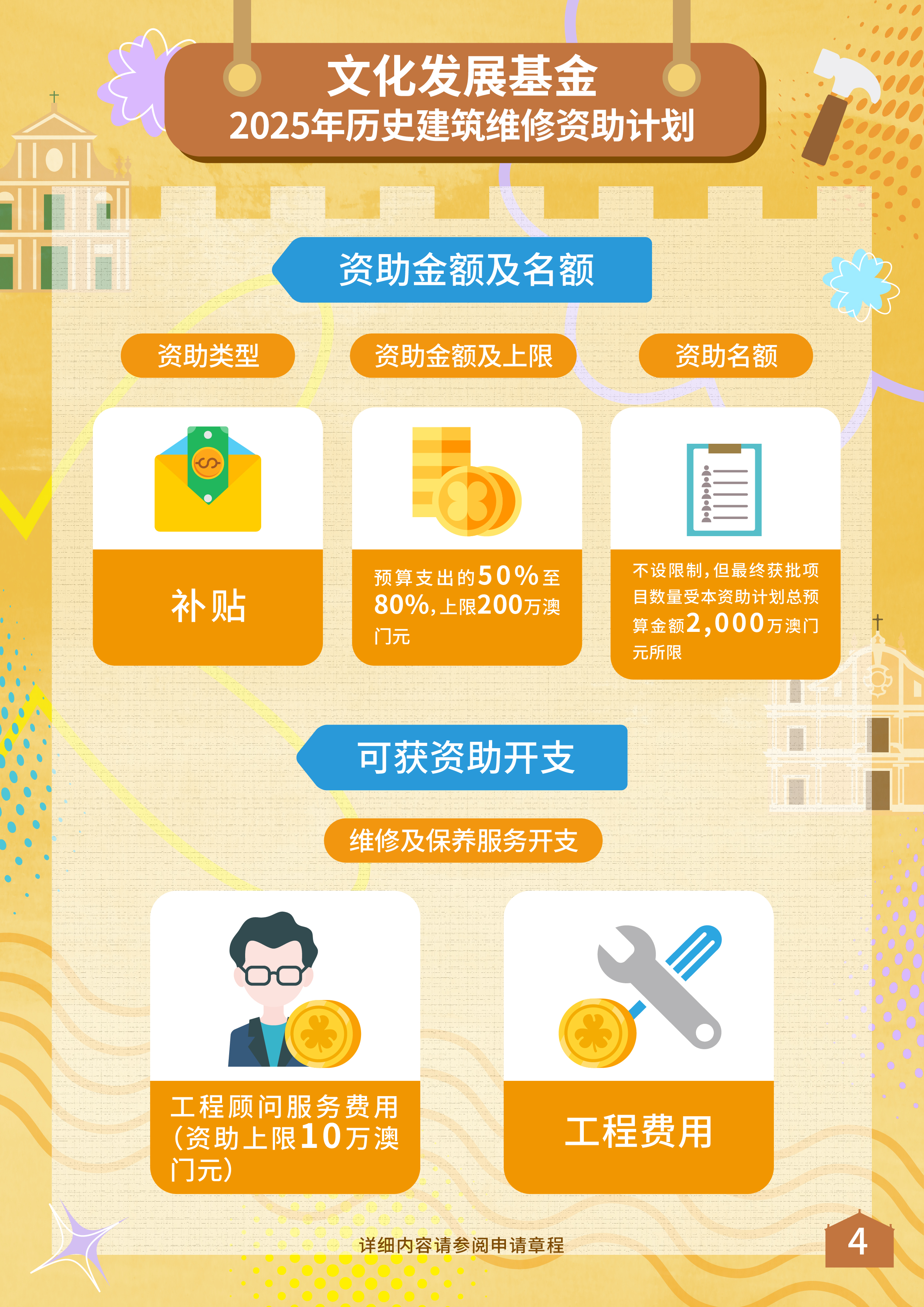 资助计划支持业权人定期对私人文物建筑和具文化价值建筑开展结构检查或检测、实施外观保养或翻新工程,以及因应检测结果实施必要的修复及维护等工作。文化发展基金将对申请项目作资格及文件审查,并送交文化局进行技术分析,接着会交由文化遗产委员会就该申请建筑物的文化价值、维修的迫切性和必要性,以及对提升社会认知和文遗保护的正面意义等因素发表意见。倘申请项目获初步通过,基金将通知申请人提交由顾问服务公司拟定的历史建筑维修方案,后续由基金的活动和项目评审委员会就申请项目的维修工程必要性、建筑物状态的预期改善效果、预算合理性作出评分。