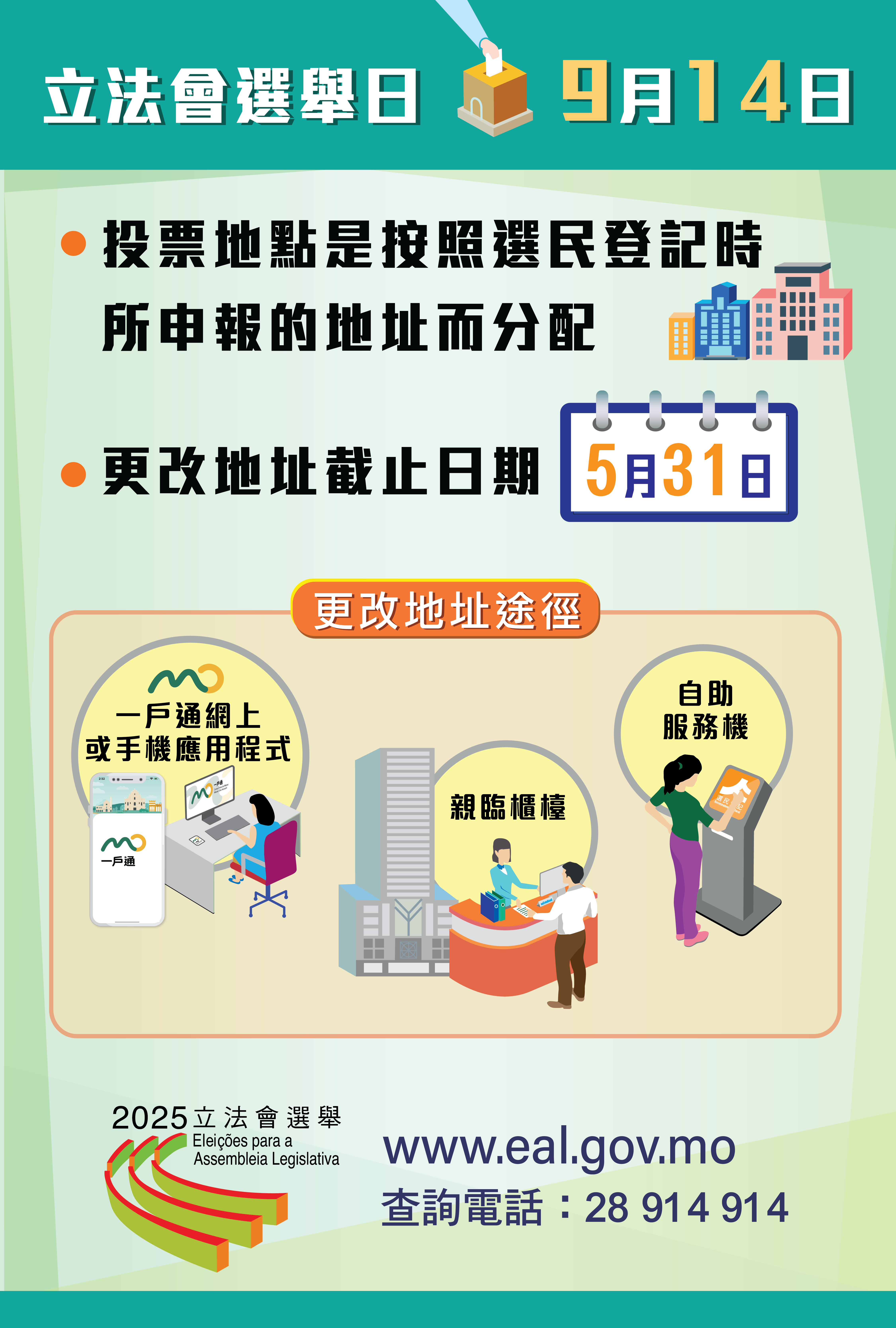 为着今届立法会选举,有需要的选民可最迟于5月31日透过一户通、选民登记网页(www.re.gov.mo)、自助服务机(地点清单:https://www.re.gov.mo/zh/s/briefCKiosk.html#kiosk),或亲临公共行政大楼地库选举事务接待柜枱,更改选民登记地址。