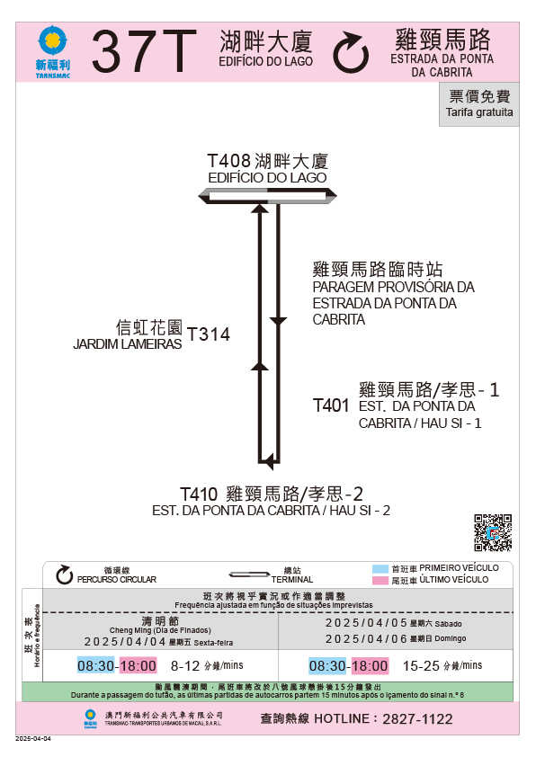 为便捷市民扫墓,4月4日至及6日于西坟马路、虔信街、氹仔鸡颈马路及路环乡村马路一带实施临时交通措施(详情可查阅附表1);同时局方协调巴士公司营运接驳氹仔扫墓地点与市区的清明时节性巴士路线37T(具体营运资料可查阅附图),供市民免费搭乘,而驾车人士亦可把车辆停泊在湖畔大厦停车场,再转乘免费接驳巴士前往扫墓地点。局方呼吁市民尽量使用公共交通工具,以及错峰出行前往扫墓。