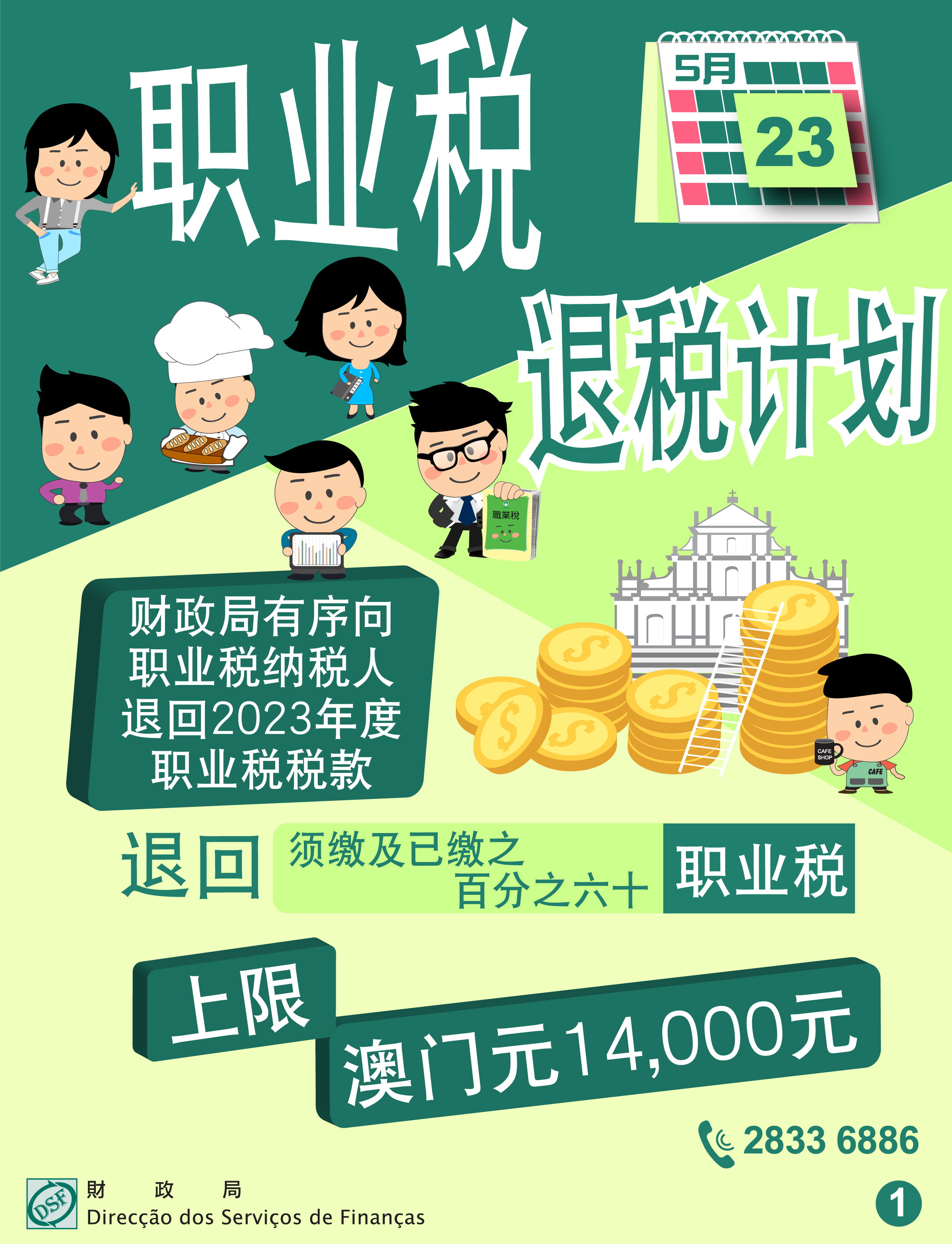 根据第25/2024号法律《2025年财政年度预算案》第二十条的规定,财政局将于5月23日起有序向2023年12月31日持有澳门居民身份证的职业税纳税人,退回2023年度须缴并已缴纳的职业税税款百分之六十,上限为澳门元14,000元,将有16.5万名纳税人获得退税。