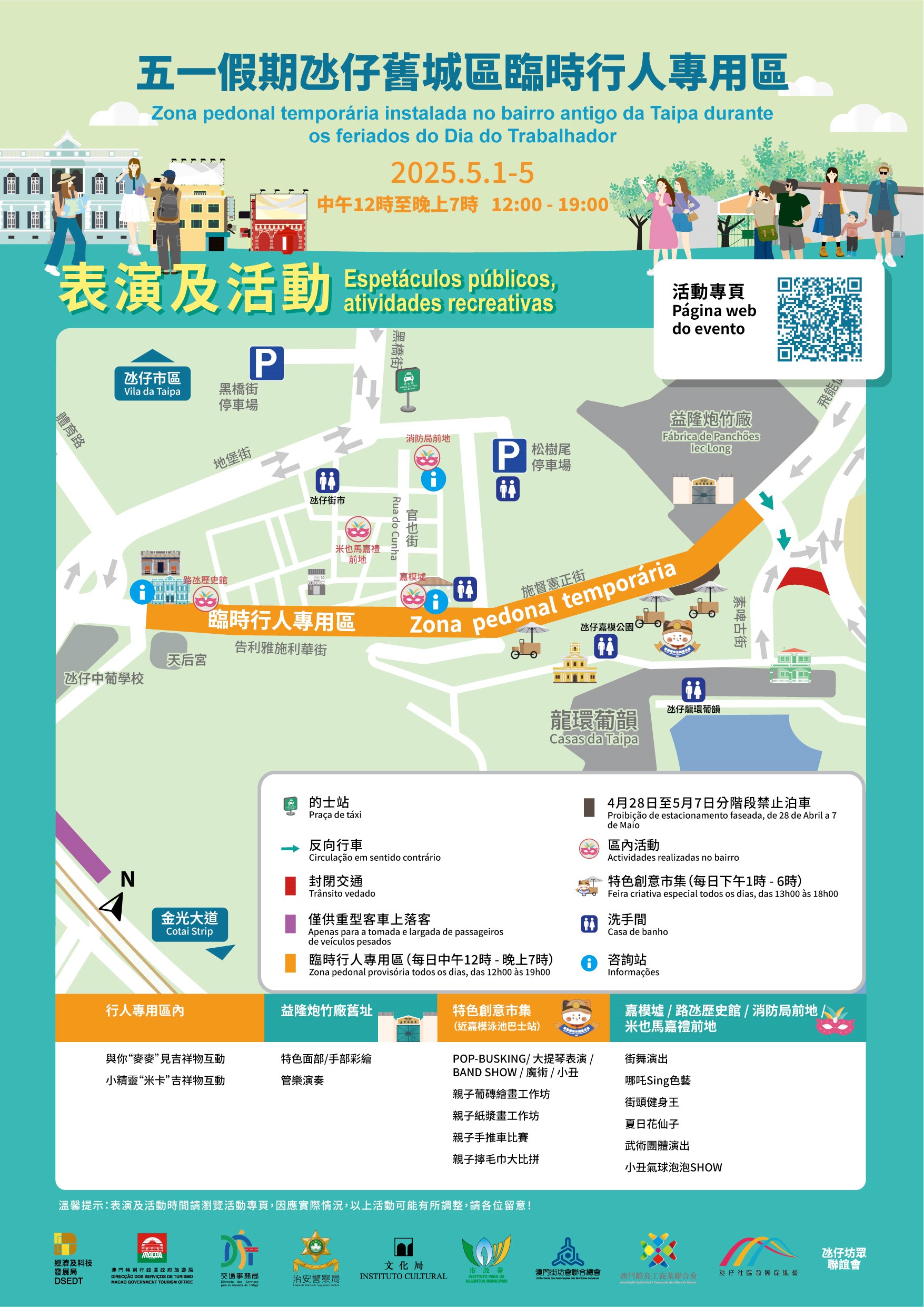 为确保五一期间氹仔旧城区人流及交通有序通行,营造舒适安全的环境,经济及科技发展局、交通事务局、治安警察局、旅游局、文化局及市政署,联同澳门街坊会联合总会、氹仔社区发展促进会、氹仔坊众联谊会及澳门离岛工商业联合会合作设置“五一假期氹仔旧城区临时行人专用区”。
