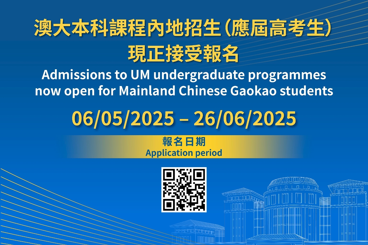 澳门大学2025/2026学年本科课程内地招生(应届高考生)现正接受报名,合资格的内地应届高考生可于5月6日至6月26日期间透过澳大官网填写网上报名表。