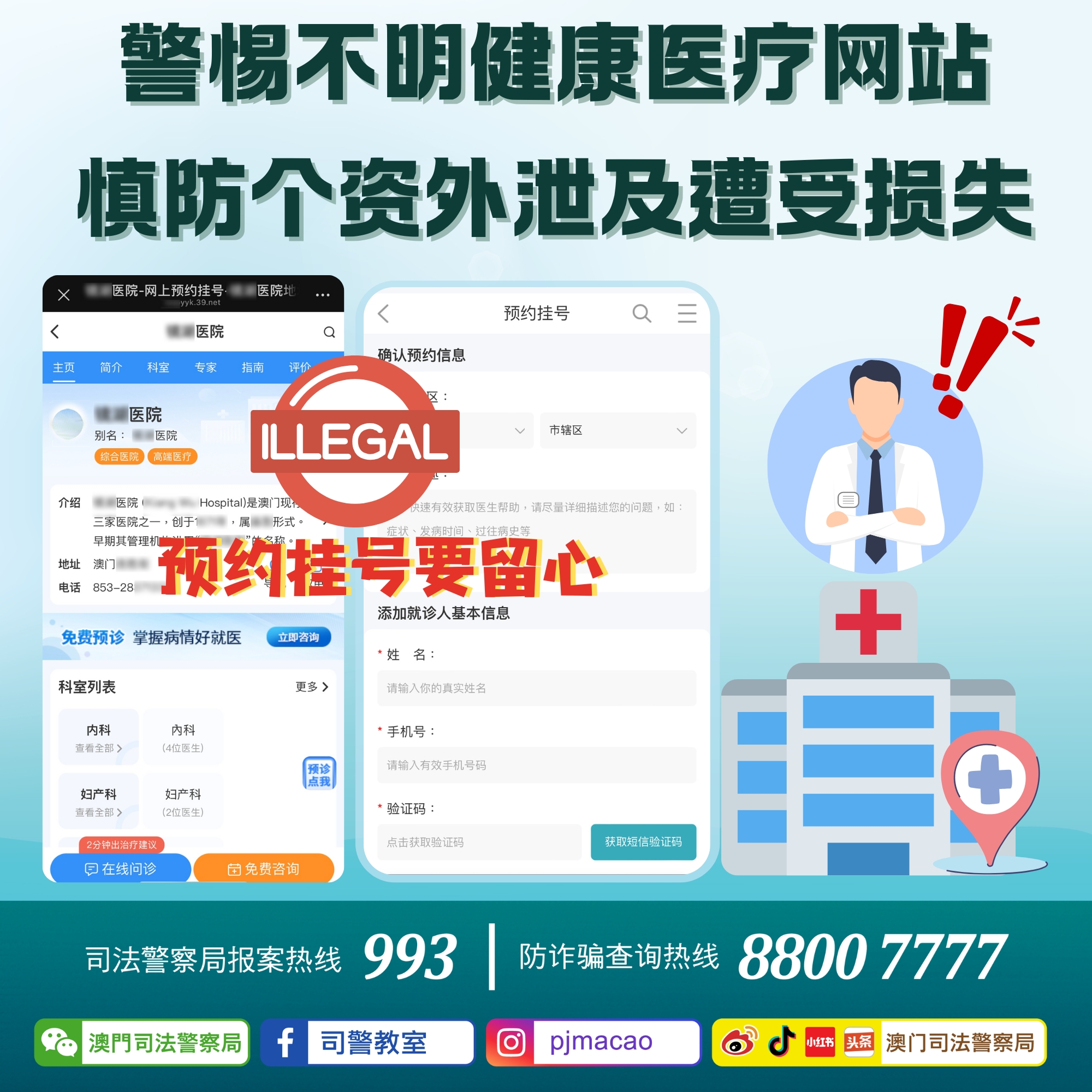 司警局近日接获通报,指有内地健康网站未经许可擅自盗用本澳多家医院名称及医生资讯,假冒线上预约挂号界面,要求使用者填写姓名、手机号码等个人资料进行预约挂号。卫生局及有关医院已澄清,强调从未授权该网站提供预约挂号等相关服务。