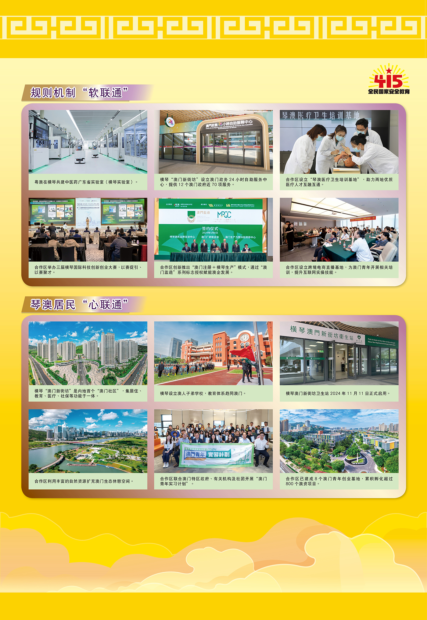 本次展览第五部分以“抢抓机遇 合作共赢 实现协同发展效能新飞跃”为主题,阐述横琴粤澳深度合作区作为丰富“一国两制”的新示范,正持续开创建设新局面。今年年初,中央港澳工作办主任、国务院港澳办主任夏宝龙及行政长官岑浩辉分别前往合作区考察调研,了解合作区规划建设及产业发展情况。粤澳双方紧紧围绕促进澳门经济适度多元发展的初心,不断加强基础设施“硬联通”、规则机制“软联通”、琴澳居民“心联通”,推进琴澳一体化发展。