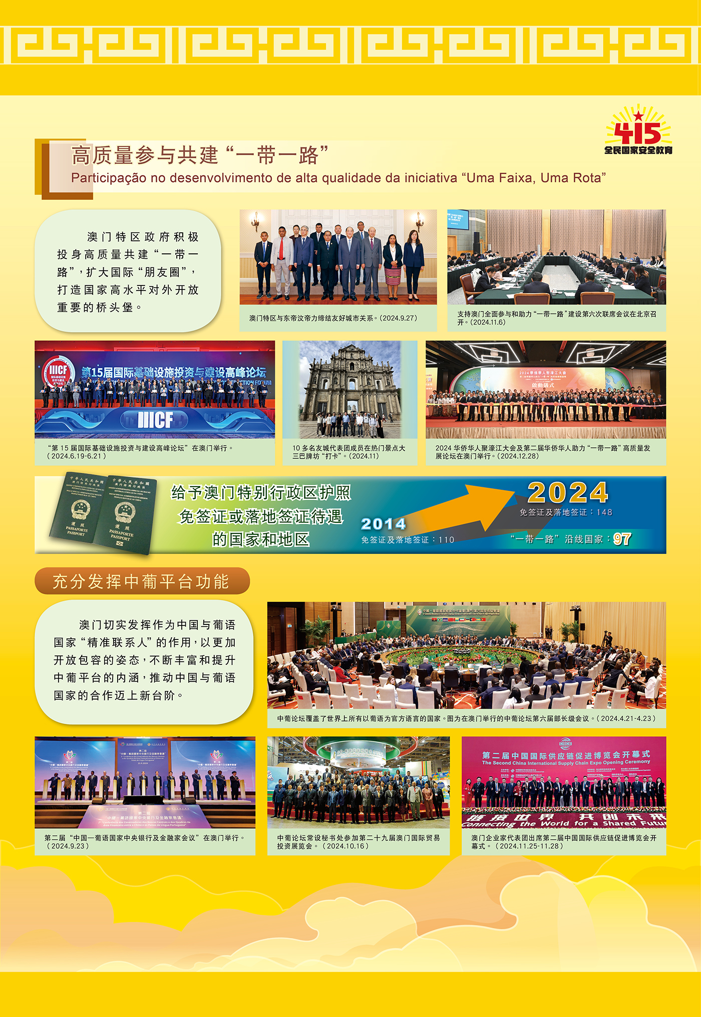 共建粤港澳大湾区方面,澳门特区携手大湾区各城市,把握定位、创新思维,强化规则衔接、机制对接,深化大湾区合作,实现协同发展。特区政府并持续深化与内地省市部门及香港特区之间的交流合作,实现互利共赢。与此同时,澳门特区高质量参与共建“一带一路”。