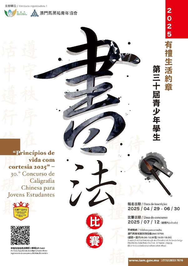 为持续推广“有礼生活约章”树立良好公民行为,推动青少年在日常生活中奉行有礼生活,以及传承中国书法艺术,弘扬中华优秀传统文化。市政署与澳门马黑佑青年协会将主办“有礼生活约章第三十届青少年学生书法比赛”,报名期由即日起至本年六月三十日,比赛则安排于七月十二日进行。
