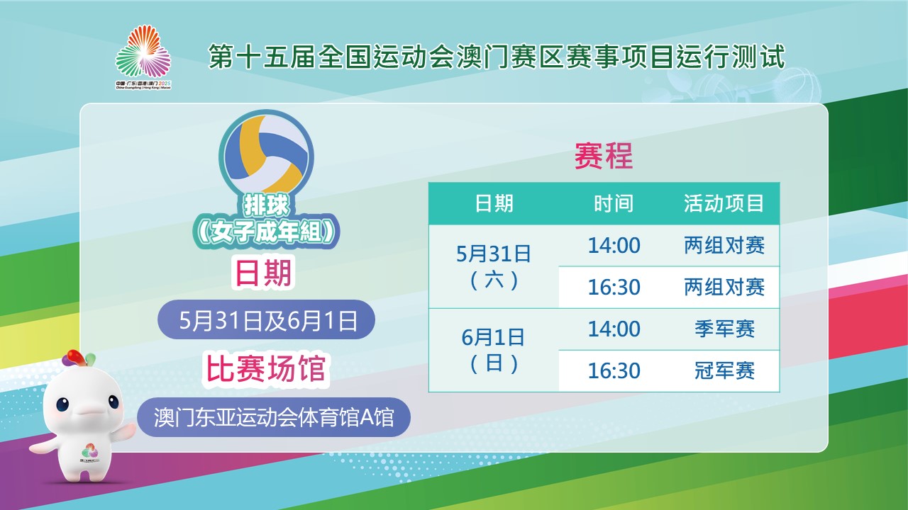 第十五届全国运动会澳门赛区排球(女子成年组)项目运行测试于5月31日及6月1日在澳门东亚运动会体育馆A馆举行,活动由十五运会及残特奥会澳门赛区筹备办公室主办,中国澳门排球总会协办,邀请了广东、湖南与澳门两支球队作赛,赛事将于下午两时开始,持票人士可在比赛开始前一小时入场,欢迎市民及旅客入场观赏比赛。