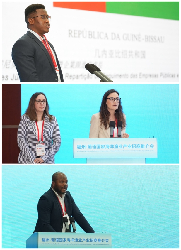 九个葡语国家代表推介了本国海洋经济的政策和商机,福州市渔业重点园区连江县、福州元洪投资区、马尾深海时代产业园介绍了深远海养殖优势、智能冷库、水产加工等情况,宏东渔业股份有限公司、宏龙海洋水产有限公司、正冠渔业开发有限公司介绍了远洋捕捞、养殖加工的先进技术及经验。