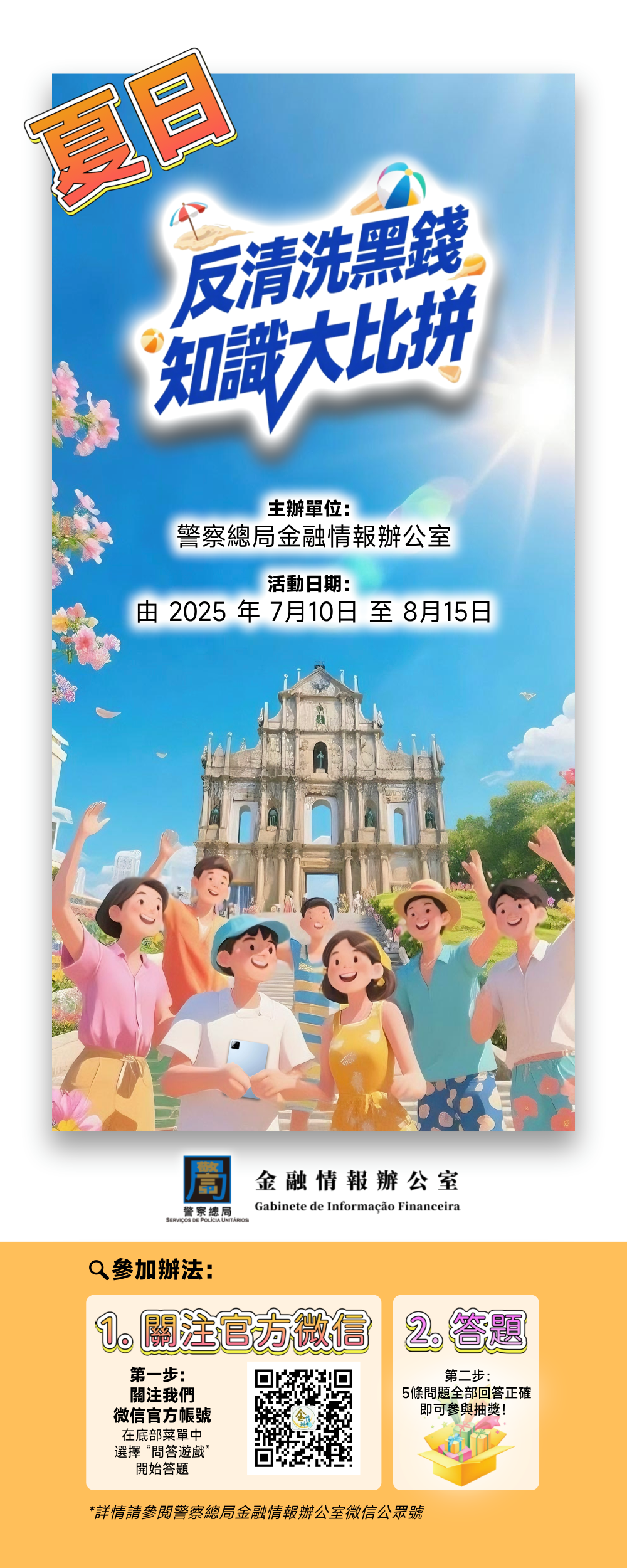 为普及本澳市民对预防清洗黑钱及资助恐怖主义的犯罪活动之认知,增强社会对相关风险防范的意识,警察总局金融情报办公室于2025年7月10日至8月15日期间,透过知识问答形式举办夏日“反清洗黑钱知识大比拼”,并以抽奖活动鼓励市民参与。