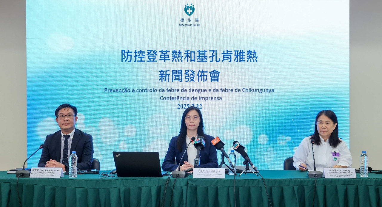 卫生局联合市政署今(22)日举行新闻发布会,介绍登革热和基孔肯雅热的防控措施,旨在深化居民对此两种疾病的认识,提升居民防范蚊媒传播疾病意识并共同加强执行各项防蚊措施。卫生局疾病预防及控制中心梁亦好主任、市政署环境卫生及执照厅冯惠星厅长、卫生局仁伯爵综合医院内科(感染病专科)范韫明顾问医生共同出席了新闻发布会。