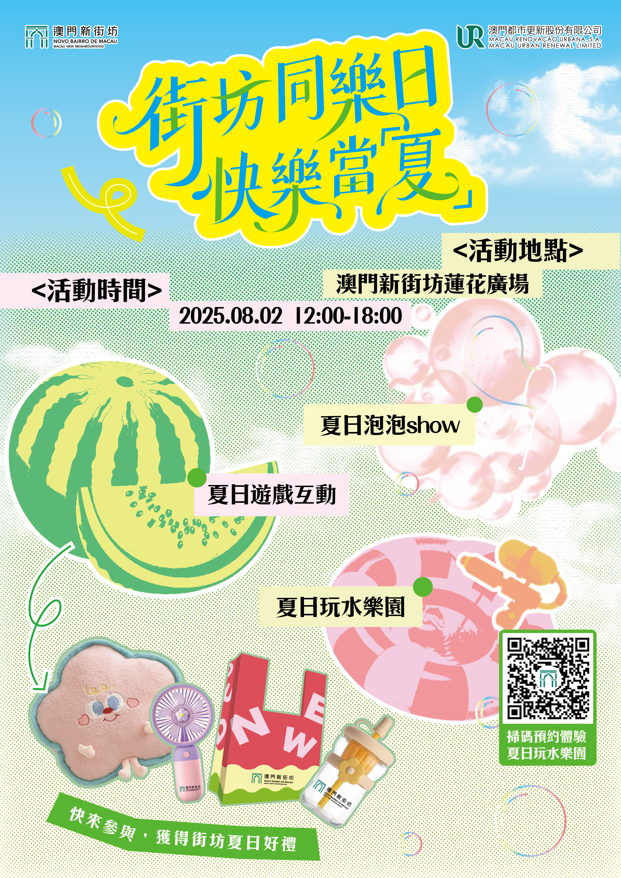 适逢暑假,横琴「澳门新街坊」将于8月2日(周六)中午12时至下午6时在新街坊莲花广场举办「街坊同乐日‧快乐当『夏』」亲子嘉年华。活动融合夏日风格的游戏、互动体验与市集等,并设有超过800份礼物奖品,诚邀广大市民亲临澳门新街坊参与,在暑假期间尽情玩乐。