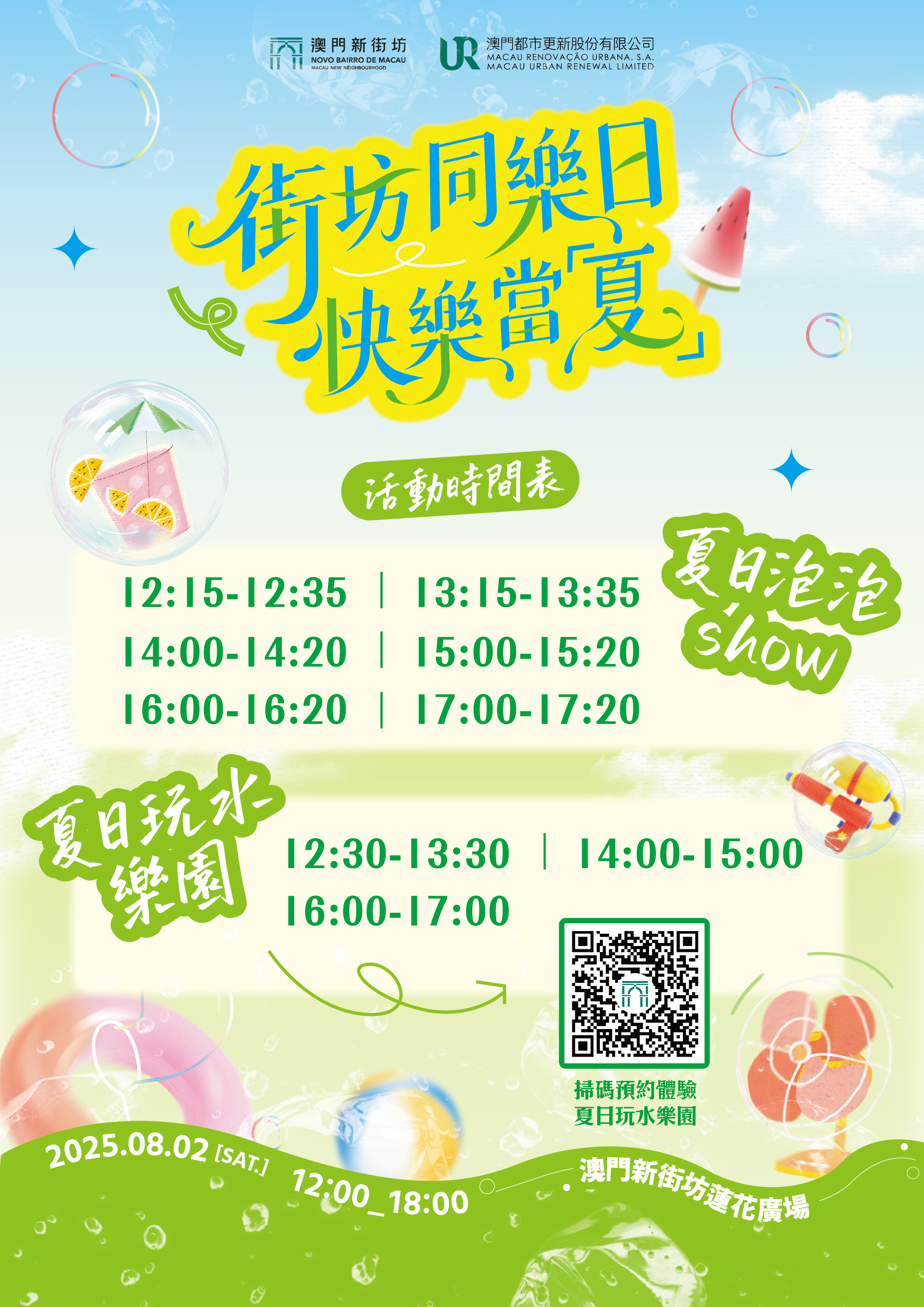 「街坊同乐日‧快乐当『夏』」的两项重头戏分别是「夏日泡泡Show」及「夏日玩水乐园」,一起透过有趣的互动节目释放快乐多巴胺,现场还会随机派发泡泡棒,尽情享受夏日乐趣。其中,「夏日玩水乐园」提供多种趣味玩乐设备和水池,开放对象予5至12岁的小朋友,有意报名家长可透过海报上的二维码预约登记场次,费用全免,名额有限,先到先得。