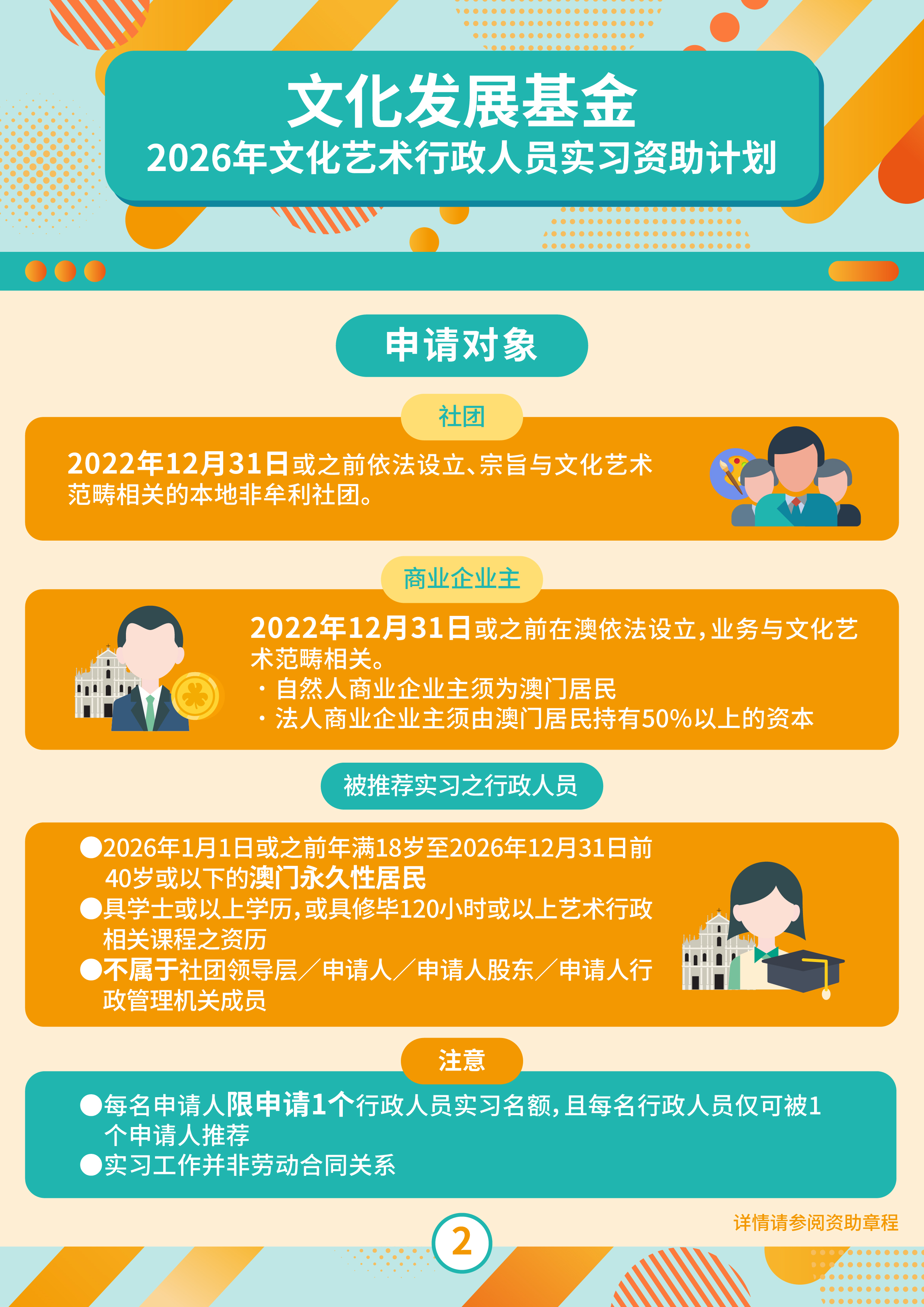 凡于2022年12月31日或之前已在澳门依法设立、属文化艺术范畴相关的本地非牟利社团,或符合前述条件且由澳门特区居民拥有50%以上资本之商业企业主,可作为申请人推荐1名年满18岁至40岁或以下、不属于其单位领导层或股东的澳门永久性居民参与本项实习资助计划。