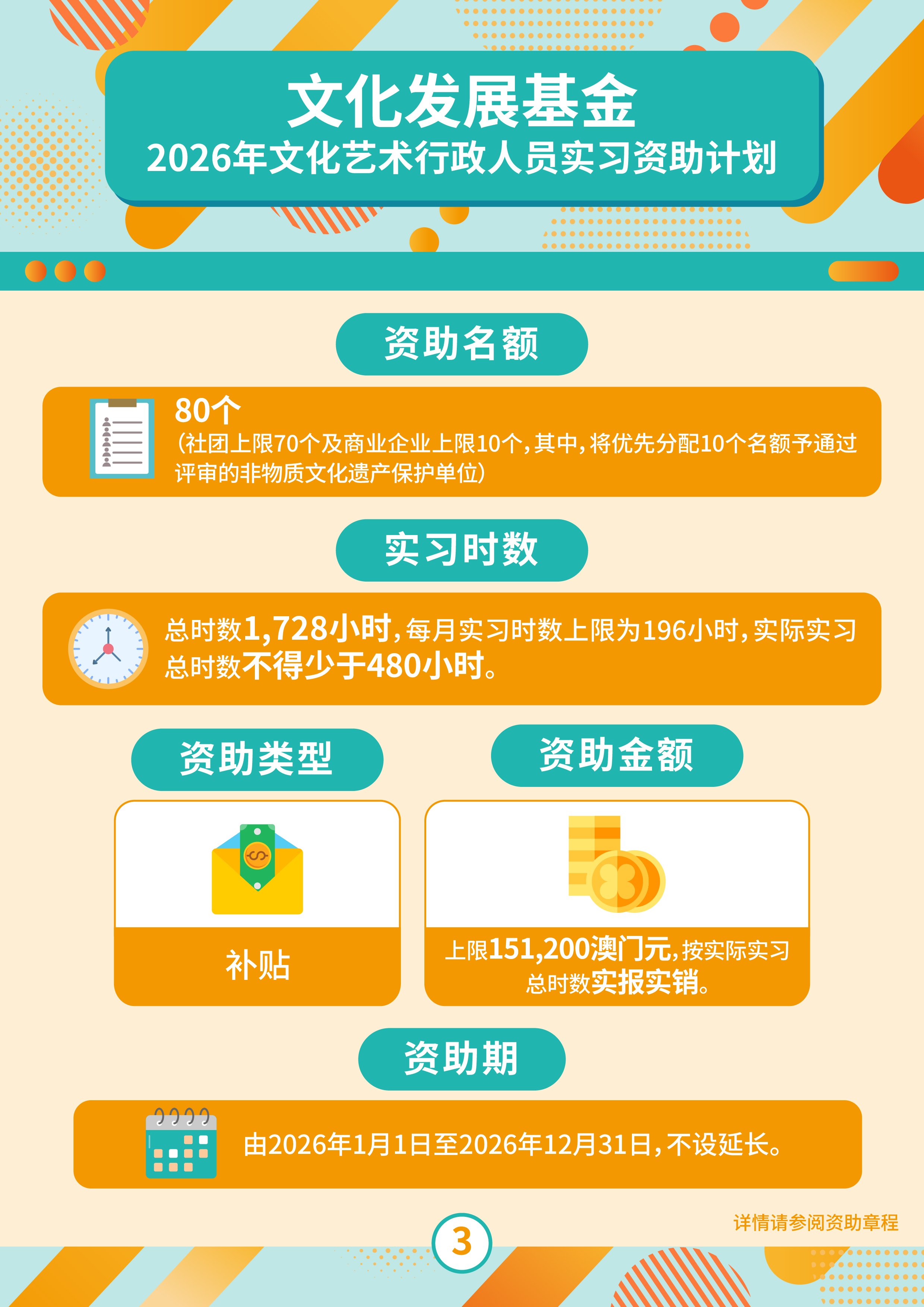 文化发展基金于8月1日至8月25日接受“文化艺术行政人员实习资助计划”的申请,鼓励本澳文化艺术社团或商业企业通过参与此项计划,提供有关文化艺术活动策划、统筹、行政及技术等实习机会,为本澳培养文化艺术范畴行政人员,从而促进澳门整体文化艺术的健全发展。
