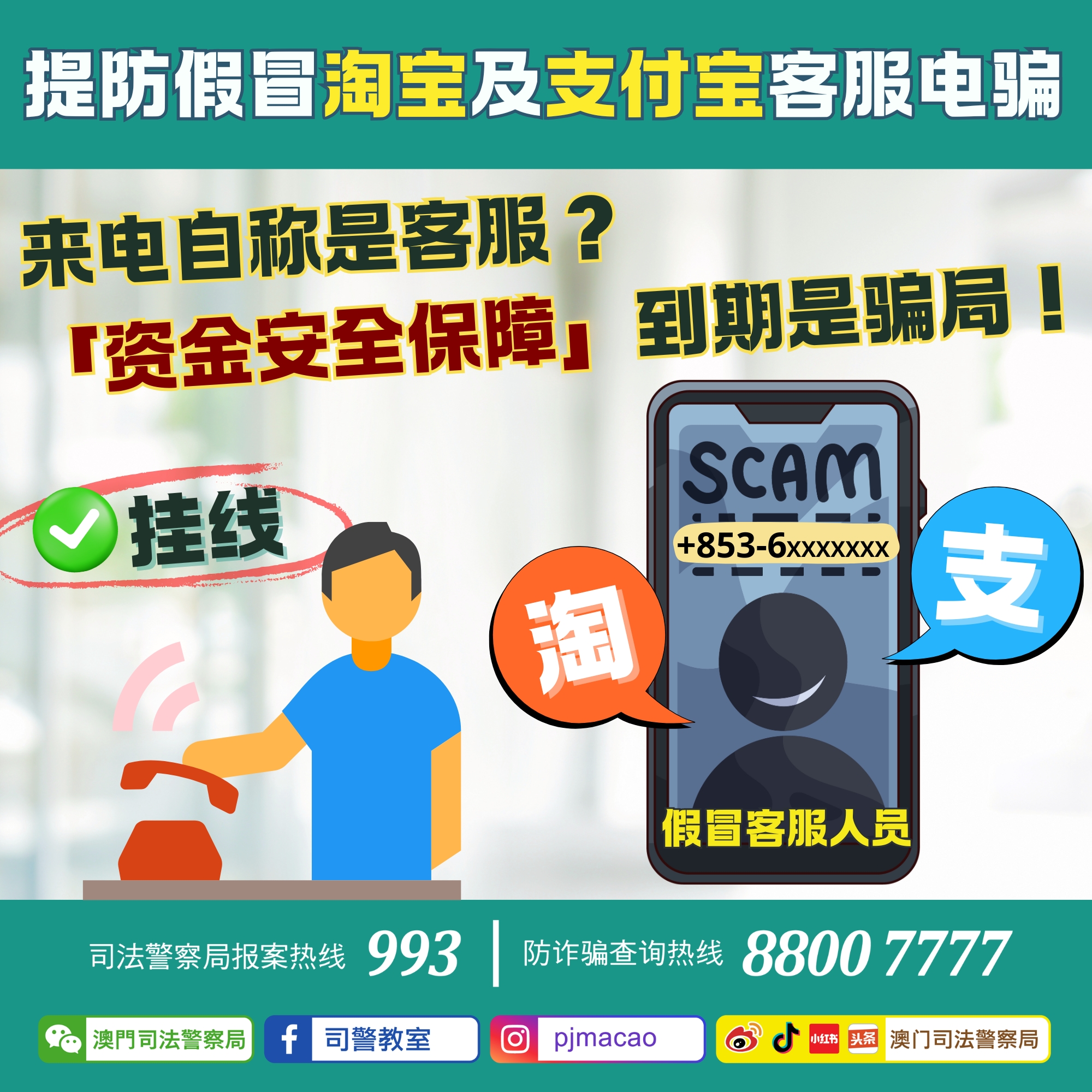 司法警察局自8月11日起,透过反诈程式及防诈骗查询热线,分别接获至少16名市民举报,报称收到冒充「淘宝」及「支付宝」客服的诈骗电话,而来电均显示「+853」开首的流动电话号码。骗徒在来电中会声称事主上述应用程式内的「资金安全保障」即将到期,若不取消将被收取高额费用。随后,骗徒再冒充其他金融机构的「客服」联络事主,讹称协助取消保险手续,伺机诈骗金钱。