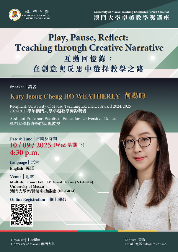澳门大学将于9月10日(星期三)举行“澳门大学卓越教学奖讲座”,2024/2025学年澳大卓越教学奖得主、教育学院助理教授何扬晴将以“互动回忆录:在创意与反思中选择教学之路”为题发表演讲,分享如何运用创意设计提升教学反思、深化课堂参与,并打造以学生为中心的学习环境。欢迎有兴趣人士参加。