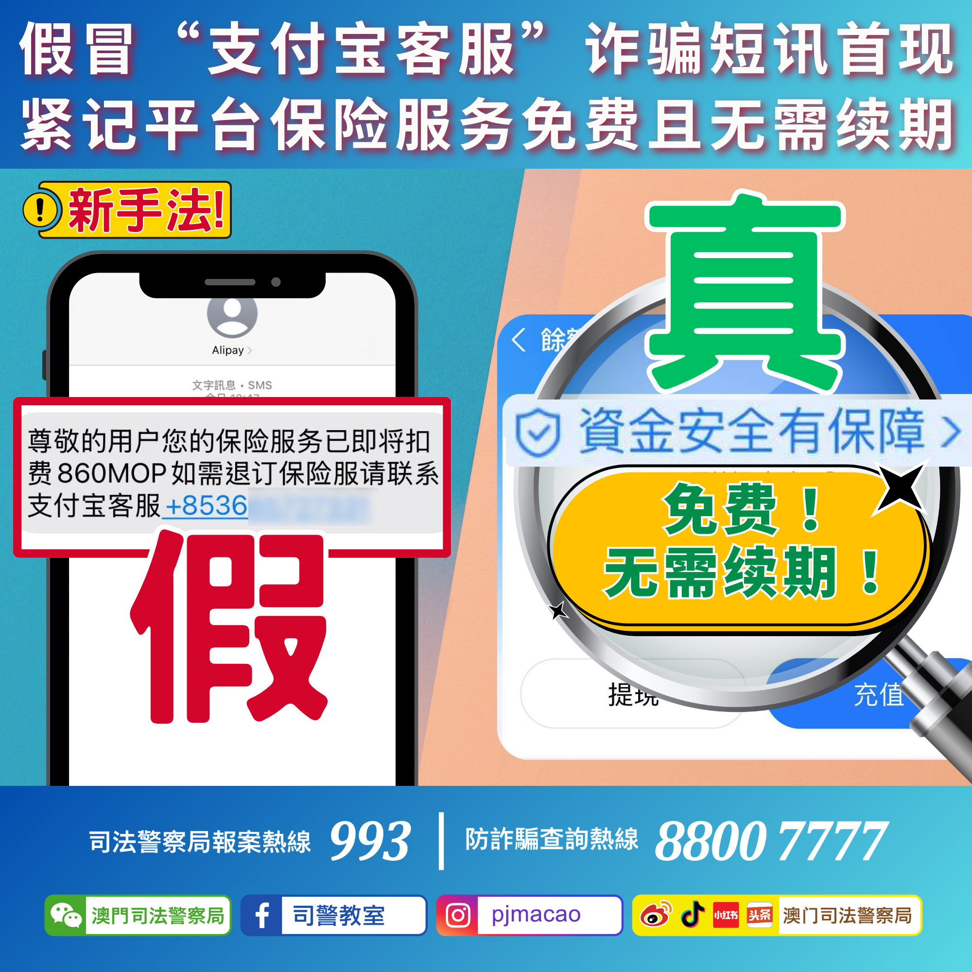 司警局今日(9月9日)发现,假冒“支付宝客服”的电话诈骗出现新手法。骗徒会假冒“Alipay”名义,随机向市民发送诈骗短讯,内容讹称「保险服务即将扣费」,并要求如欲退订,须拨打短讯内所载的电话号码,借此诱骗市民致电假冒的「支付宝客服」进行诈骗。