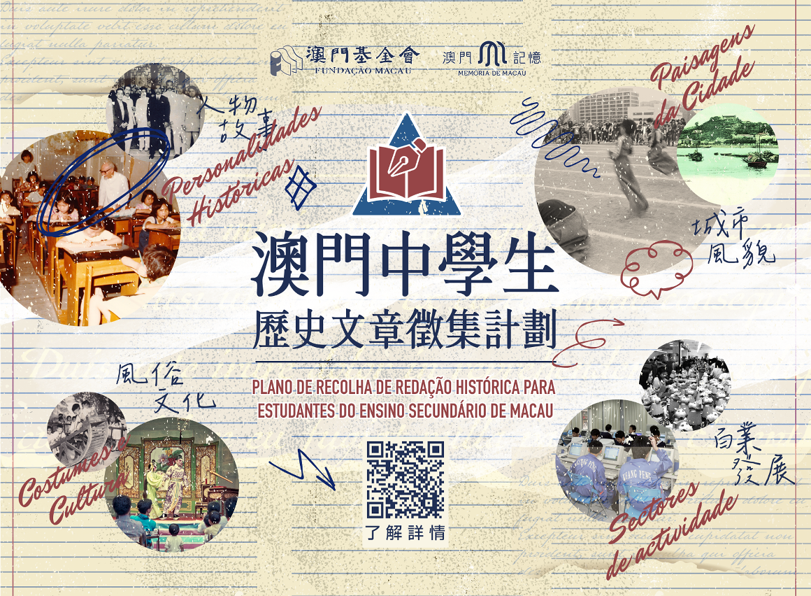 欢迎全澳中学师生踊跃参与,详情请浏览 “澳门记忆” 文史网的 “专题文章校园征集计划” 章程(https://www.macaumemory.mo/schoolzone/essaycollections)。如欲获取更多最新资讯,欢迎关注“澳门记忆”的Facebook专页、Instagram、微信订阅号、小红书号、今日头条号及YouTube频道(ID:MacauMemoryFM / 澳门记忆)。