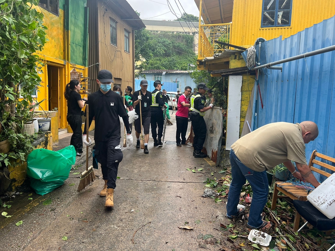 为推动市面全面恢复如常,在民防行动中心的统筹协调下,于今日上午组成联合小队,共同前往本澳各区进行清障行动。参与行动的成员包括﹕200多名保安部队及保安部门人员、200多名社区民防联络机制成员和20多名民防志愿者。并联同来自各司范畴属下部门和立法会、法院、检察院、 廉政公署及审计署等逾 1100 名公务人员组成的风后支援队展开行动。