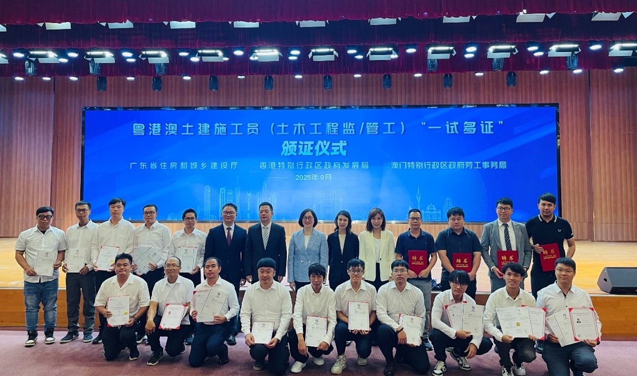 为加强粤港澳在技能人才培养方面的合作,推动三地住房和城乡建设领域技能人才的协同发展,澳门特别行政区政府劳工事务局(下称劳工局)、广东省住房和城乡建设厅(下称“广东省住建厅”)、香港特别行政区政府发展局(下称“香港发展局”)开展粤港澳土建施工员(土木工程监/管工)“一试多证”合作项目,共同建立适用于三地的培训及考试体系,便利本澳居民考取粤港澳三地互认的证书。首场试点培训于9月开办,来自粤港澳三地的79名从业员通过统一培训及考试,成为首批获得三地认可证书的从业员,其中来自本澳之获证人士共13人。