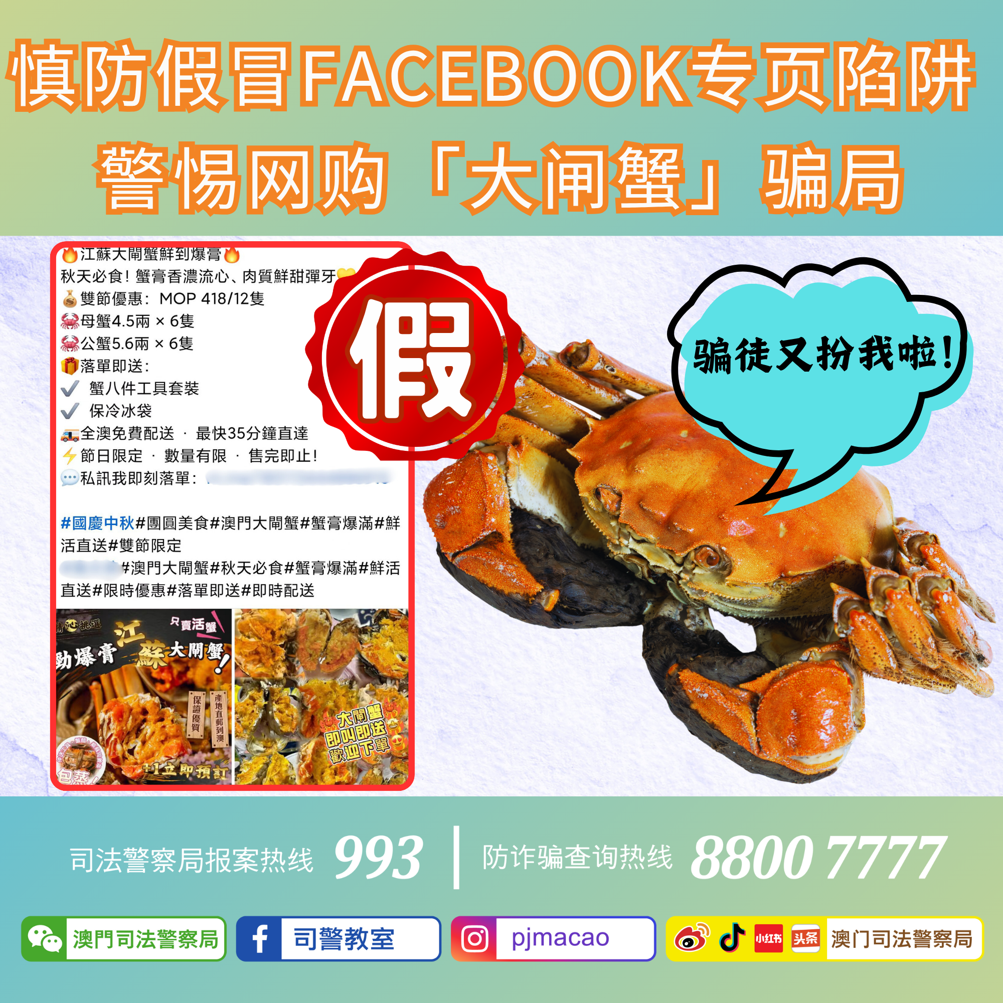 司法警察局近日接获多宗涉及“网上订购大闸蟹”的诈骗举报。骗徒于Facebook假冒本澳商户开设虚假专页,并以优惠价钱预订“大闸蟹”作招徕,吸引市民以「先付款、后取货」方式进行交易。然而当事主按对方提供的「未认证」MPay二维码进行扫码支付后,一直未有收到相关货品,并发现对方已失去联络,始察觉上当受骗。经统计,10月至今,已有5名市民被骗前来司法警察局报案,各人报称损失金额由数百至二千澳门元不等。
