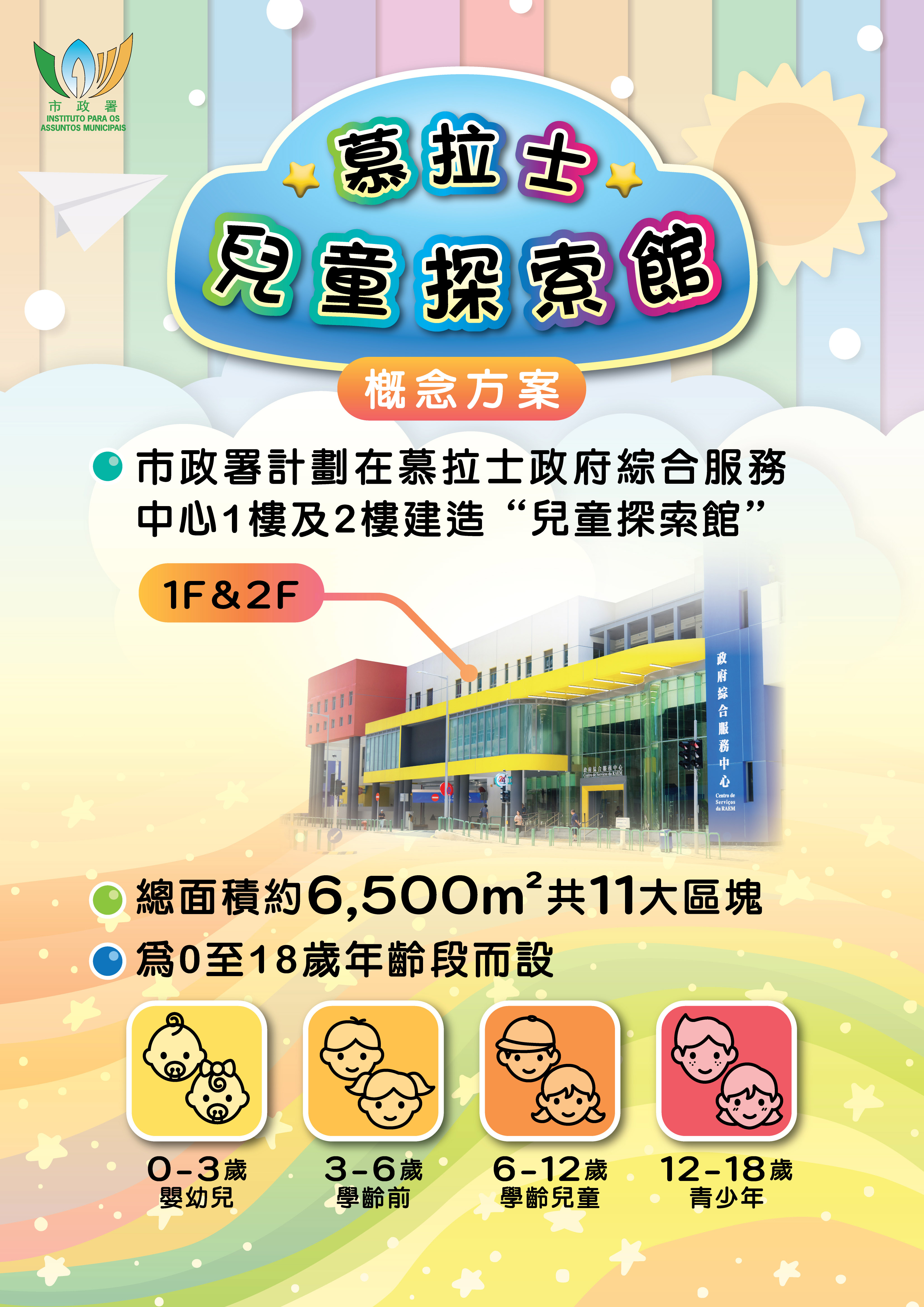 经综合分析北区人口分布和特征、区内对休憩设施的需求,市政署将于刚投入运作的慕拉士政府综合服务中心建造面积约6,500平方米的儿童探索馆,以启发创造力,培养探索精神为目标,为本澳儿童及青少年创设新颖、多元、益智的全天候游乐空间。计划于2026年启动设计,争取2027年展开工程公开招标工作,2028年第四季完工。