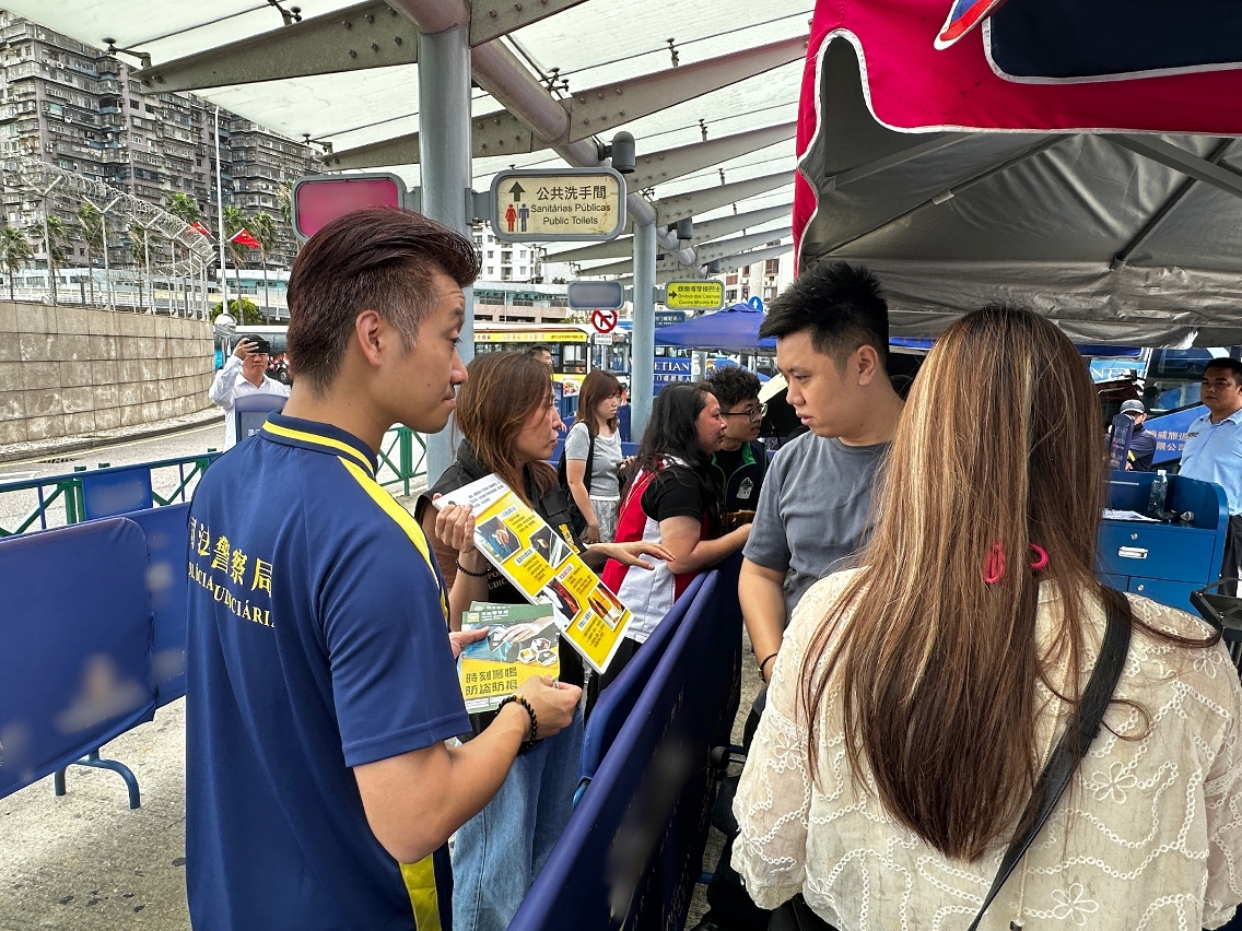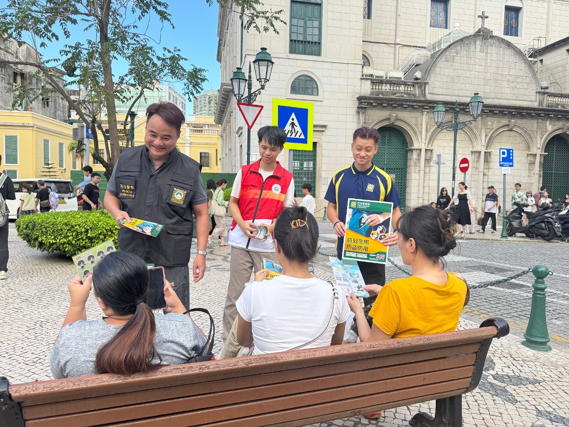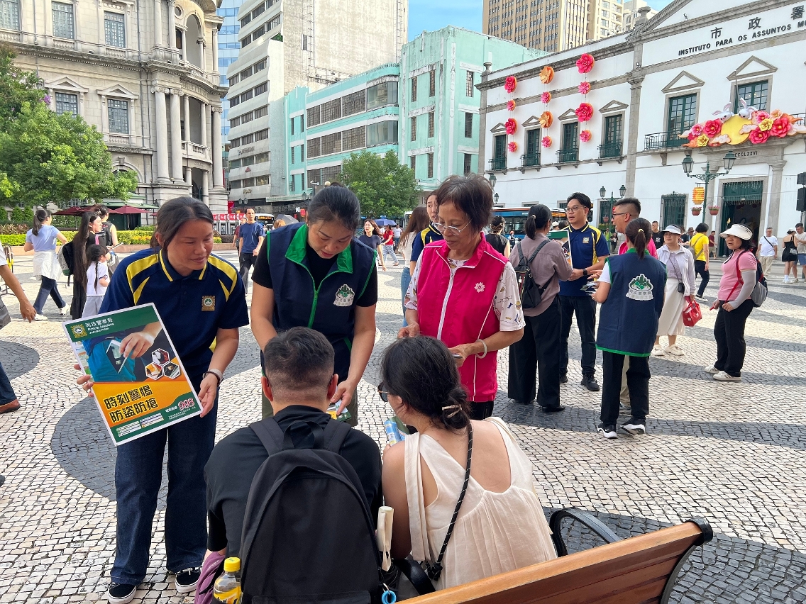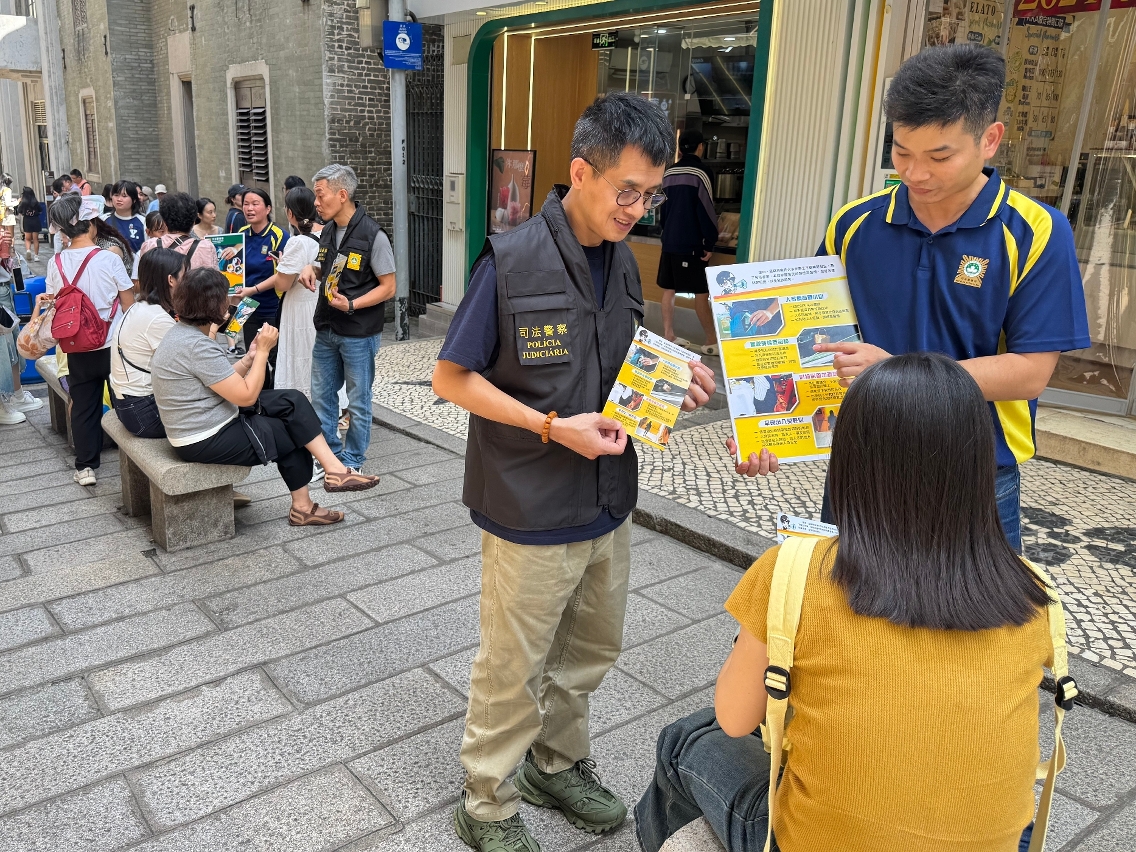 9月29日至10月10日期间,司警局第二统筹科及防止罪案科人员联同澳门街坊会联合总会、澳门工会联合总会、澳门妇女联合总会、澳门归侨总会及民众建澳联盟等已加入“司警局大厦防罪之友”的社团成员,先后前往本澳的口岸、酒店穿梭巴士站点、旅游热点及人流密集区域,向市民和旅客派发防盗资讯及报案程序宣传单张,并详细讲解各项防盗措施。司警局人员提醒市民和旅客,应时刻妥善保管随身物品,手袋背包应放在身前并拉好拉链,避免随身携带大量现金,贵重物品亦应分开存放,切记“财不可露眼”;在人多挤迫的地方及乘坐公共交通工具时,应将财物保持在视线范围内,并留意身边是否有可疑人士刻意靠近或制造碰撞。司警局人员亦向他们介绍报案程序,呼吁如遇可疑情况或不幸被盗,应立即报警求助。