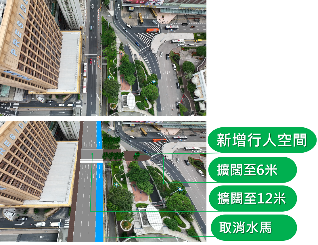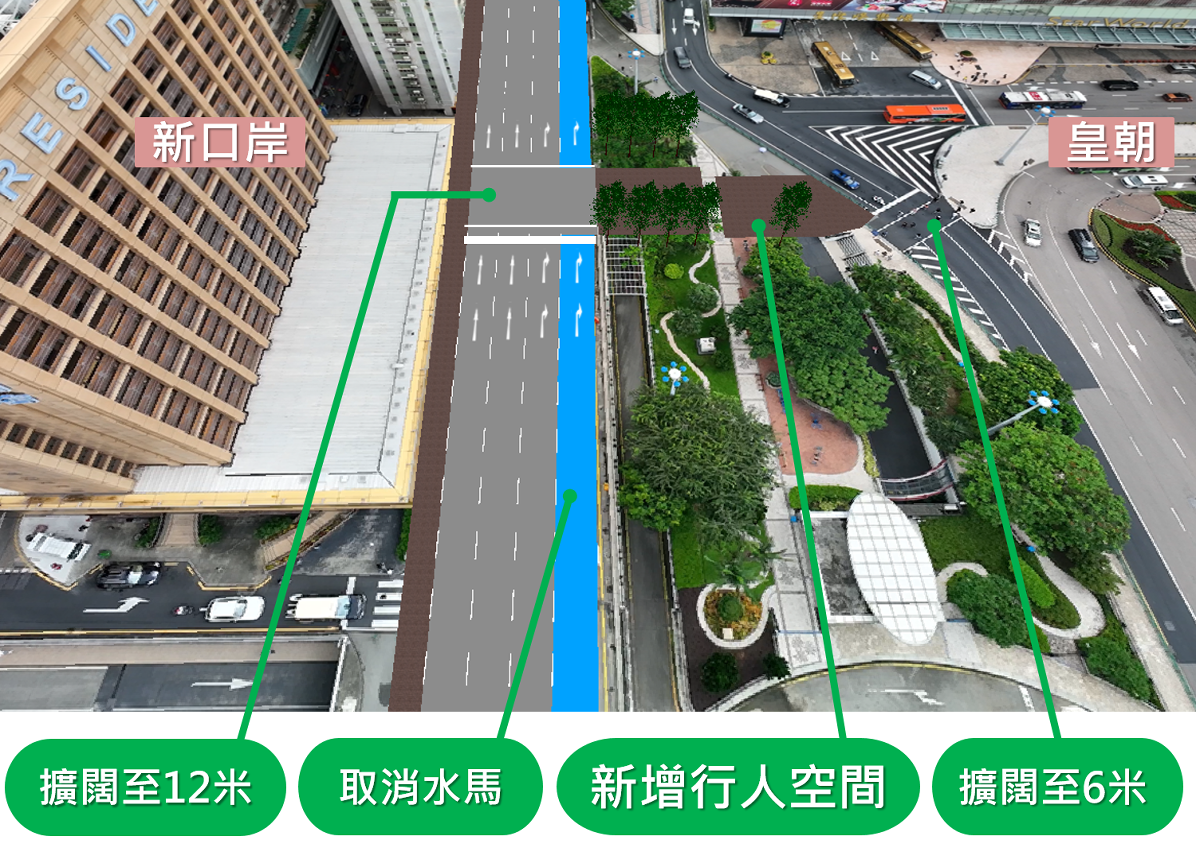 配合是次改造工程,艺园近友谊大马路一侧人行横道扩阔至12米,而近仙德丽街一侧的人行横道扩阔至6米,为行人提供舒适的步行环境横越友谊大马路及仙德丽街,另外,工程亦一并取消友谊大马路近艺园的水马以实施四线行车,优化友谊大马路的行车环境,请驾驶者留意现场的交通调整。