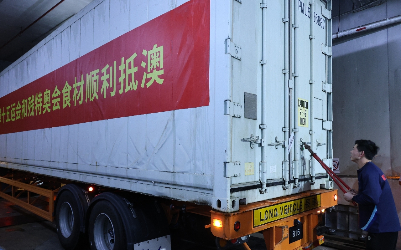 供运动员六大类食材,包括畜肉及其制品、禽肉及其制品、水产品及其制品、蛋及其制品、乳制品、调味料香辛料,已建立从源头、到专仓、到运动员餐桌的全链条食品安全及食源性兴奋剂管控工作体系。首批食材已进行出仓到澳门的程序,过程由澳门赛区组委会协调统筹;南粤集团组织备货;市政署派出兽医及检疫人员前往广州总仓,检视货物出仓、完成装载及锁上封条的流程。装载食材后的货车由广州总仓直接运送,经港珠澳大桥珠海公路口岸进入本澳,过程中内地海关及澳门海关提供便捷通关措施。