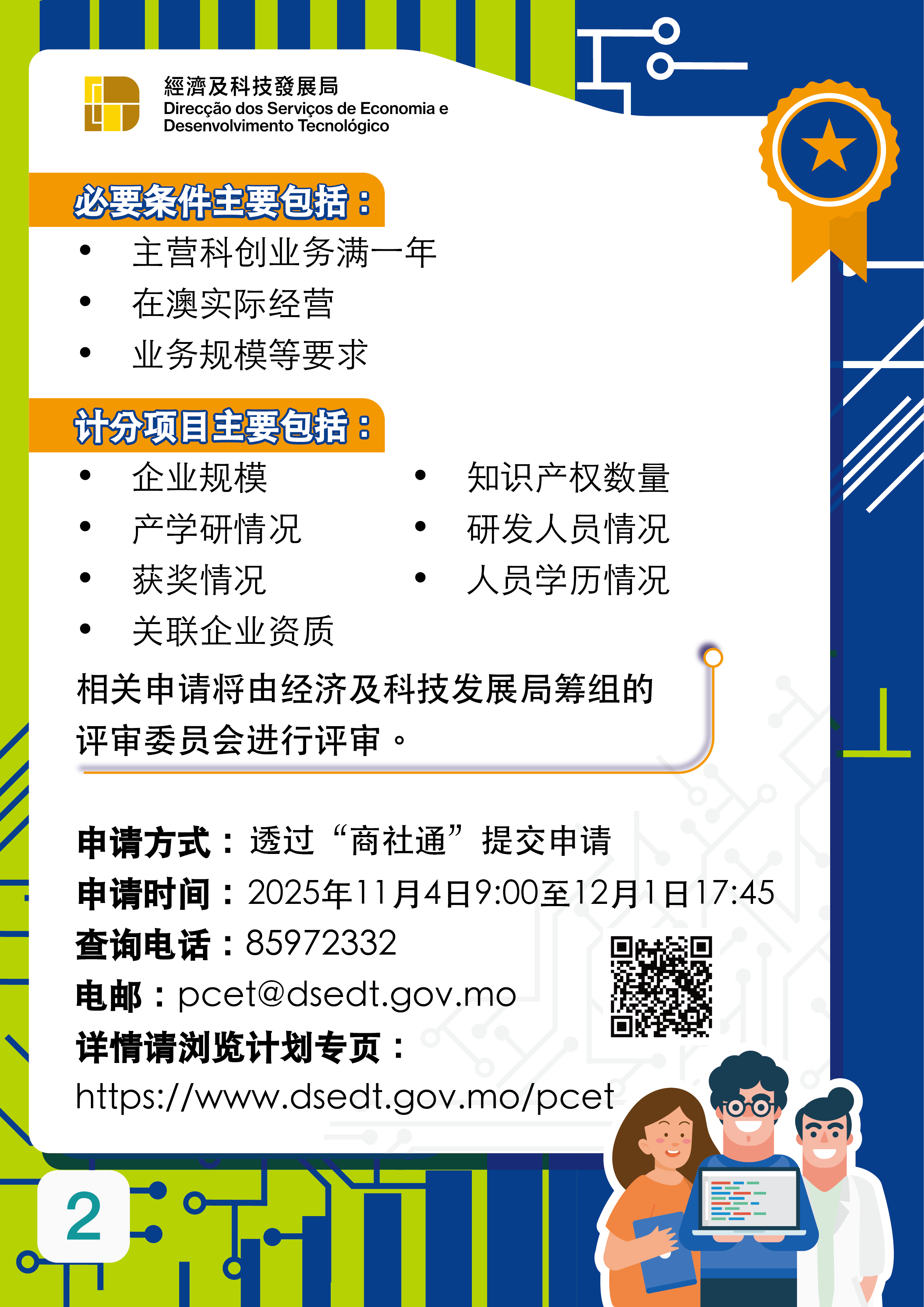 本轮申请期为2025年11月4日至12月1日,申请者可透过“商社通”平台的网上申请系统提交申请。对于获认证的科技企业,特区政府已陆续在资金、人才及配对等多方面提供支援,有关申请详情及相关的支援措施,可浏览计划专页(https://www.dsedt.gov.mo/pcet),或致电8597 2332查询。