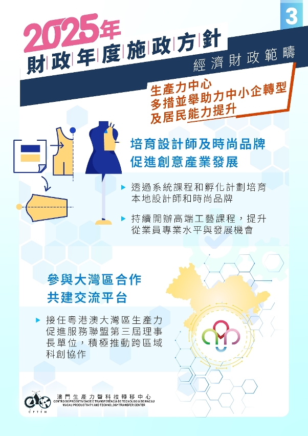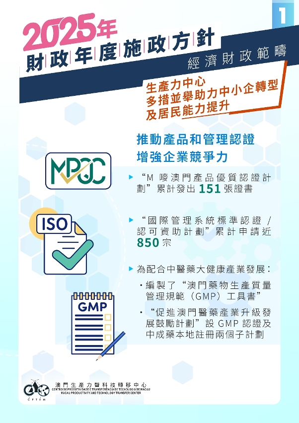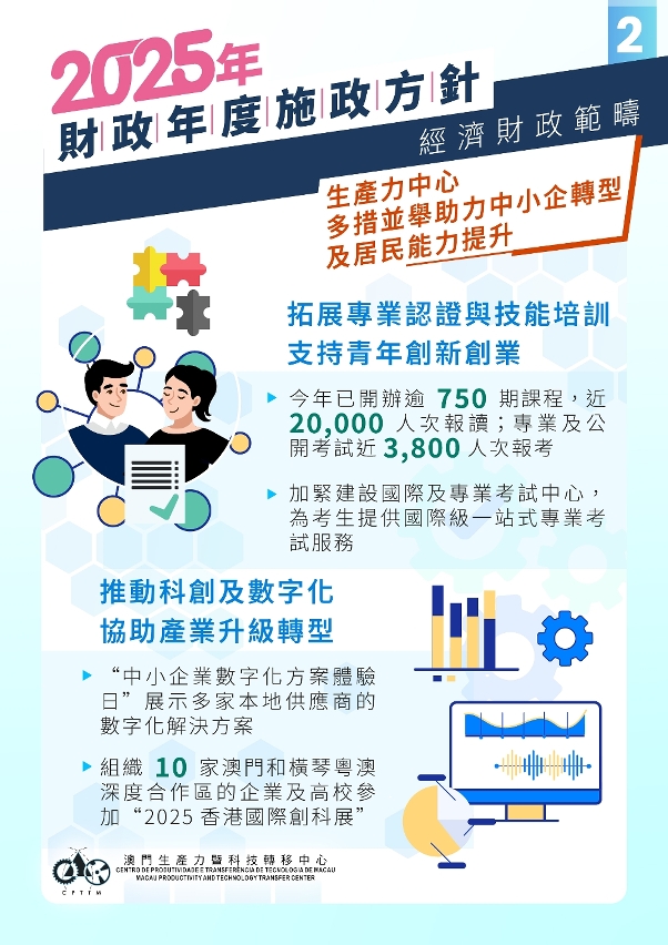 为落实2025年施政报告提出支持中小企业持续经营、创新发展和提升经营能力,并鼓励居民考取国家及国际认可的专业及职业资格的工作,澳门生产力暨科技转移中心(下称“中心”)从两大方向推动相关工作,一是协助企业,尤其是中小企业,取得认证和数字化转型;二是为居民提供技能培训及专业考试,培育各行业所需人才。
