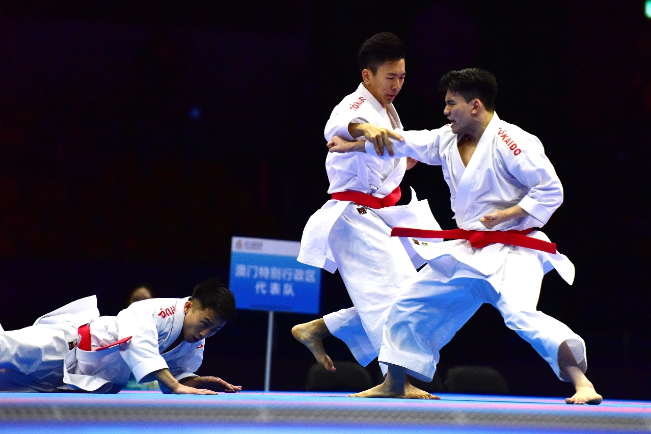 『第十五届全国运动会』今(6)日在澳门赛区进行空手道项目,坐拥主场优势的澳门队首日比赛即传来喜讯,郭建恒(KUOK KIN HANG)继2021年西安全运会勇夺个人型铜牌,为澳门夺得历史性奖牌后,今届伙拍队友郑沘珞(CHEANG PEI LOK)及方文浩(FONG MAN HOU)在男子组团体型再造出好成绩,决赛以42.7分击败香港队摘金,为澳门参加全运会以来首面金牌。澳门特别行政区行政长官岑浩辉出席颁奖礼,亲自为澳门运动员颁发奖牌。