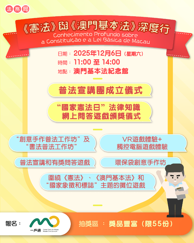 为纪念第十二个“国家宪法日”,法务局将于12月6日(星期六)上午11时至下午2时在澳门基本法纪念馆举办“《宪法》与《澳门基本法》深度行”活动,透过轻松互动的方式,加深社会大众对《宪法》和《澳门基本法》的认识。