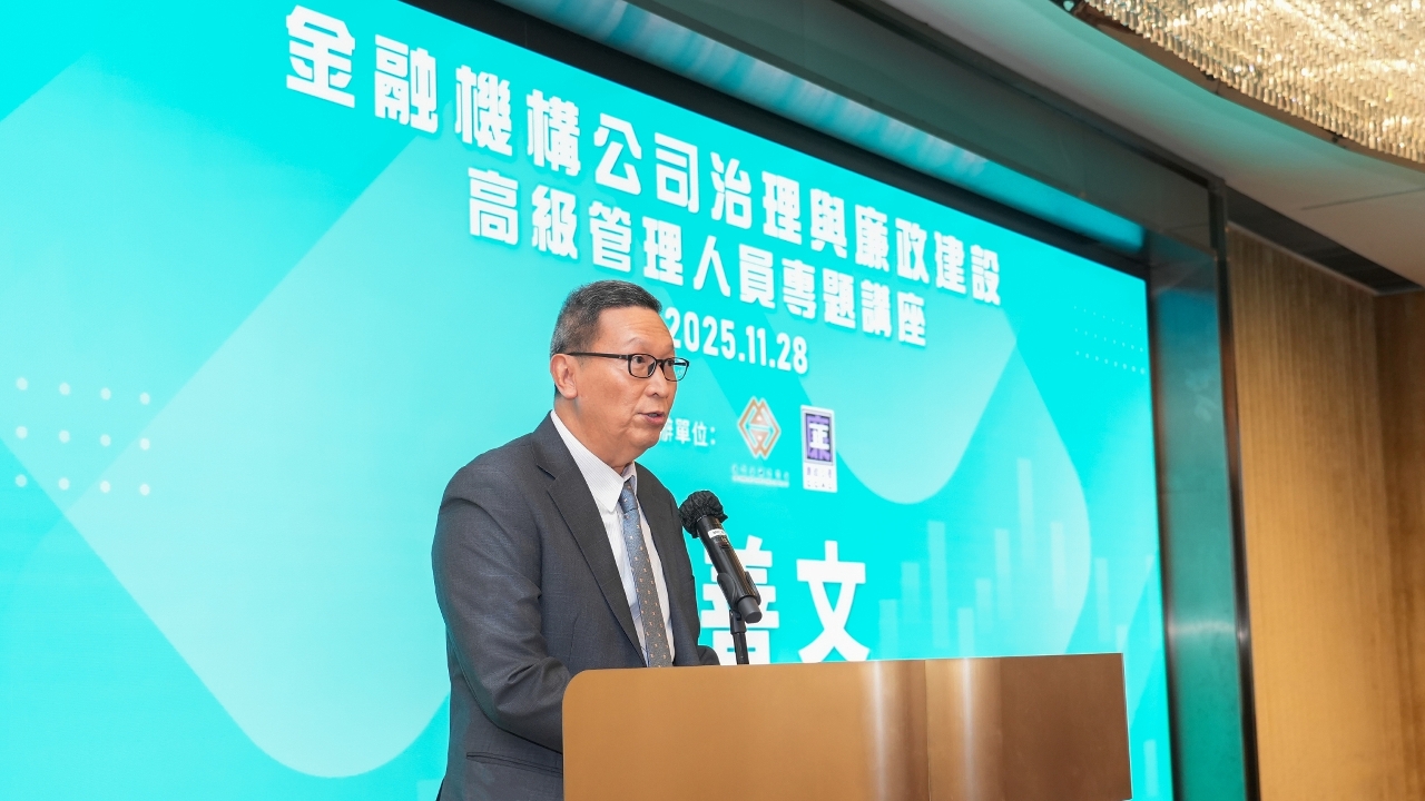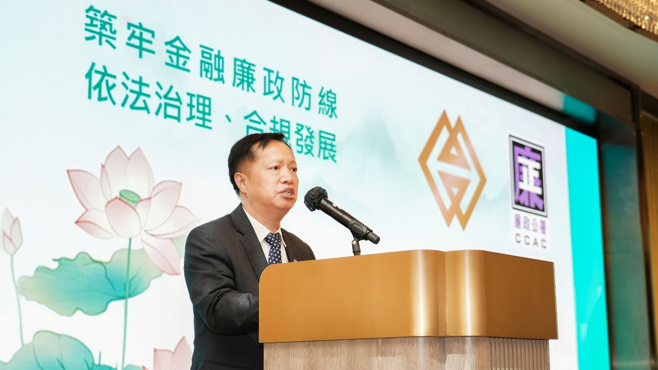 金管局行政管理委员会代主席黄善文在致辞时表示,金融体系的稳健与诚信不仅关乎市场有效运作,更直接影响社会公众的切身利益与对整个金融体系的信心。澳门作为国际化城市,其金融市场声誉是开展对外金融合作,对接内地与国际金融市场,并在国际舞台上展现更大作为的重要基石。金融机构高级管理层应以身作则,树立廉洁的营商文化。同时,严谨的内部监控机制是不可或缺的防线。他强调,每位金融从业员的个人操守,是守护金融廉洁诚信的最终屏障,期望从业人员除具备专业的知识与技能,更须恪守最高的道德标准,在面对利益冲突或不正当利诱时坚守依法合规、廉洁诚信的底线。