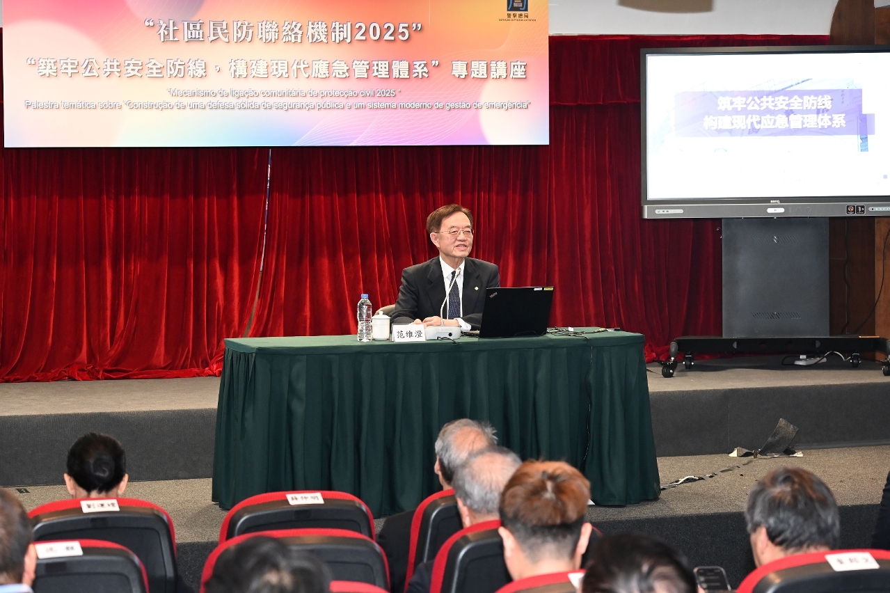 为深化民防范畴各部门对国家“大安全、大应急”框架的理解,进一步提升澳门城市安全治理水平,警察总局于12月4日在出入境事务大楼举办专题讲座,主题为“筑牢公共安全防线,构建现代应急管理体系”。讲座特邀原国务院参事、原国家减灾委专家委副主任闪淳昌教授,以及中国工程院院士、清华大学公共安全研究院院长范维澄教授担任主讲嘉宾。保安司司长陈子劲、警察总局局长梁文昌,联同民防架构、社区民防联络机制代表,以及民防志愿者合共140人出席。活动在各方代表的支持下,设有40个线上直播点,线上参与总人数逾920人。