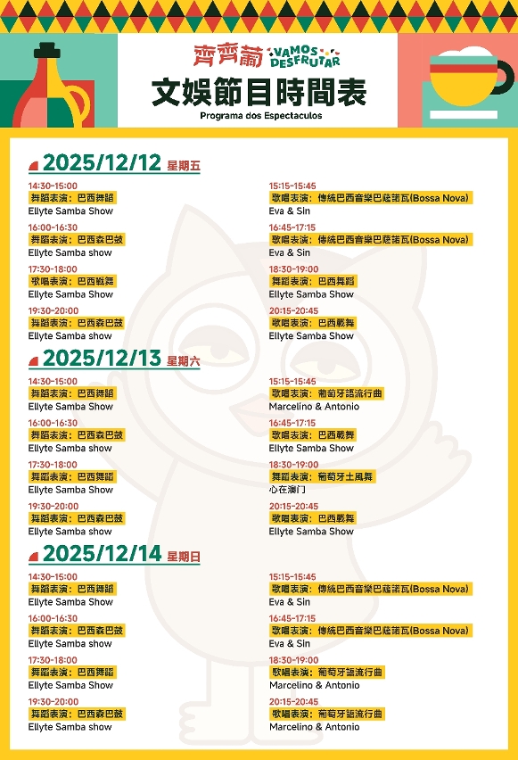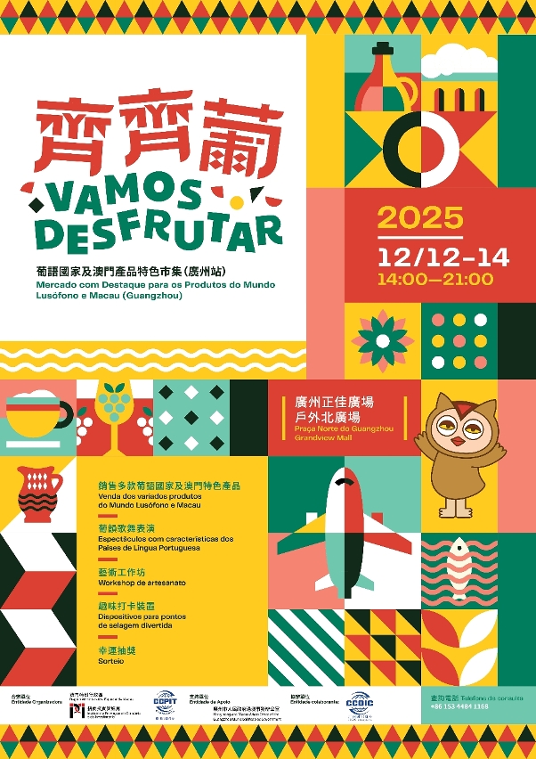 • 2025“齐齐葡-葡语国家及澳门产品特色市集”(广州站)将于12月12日至14日(周五至周日)在广州正佳广场户外北广场举行