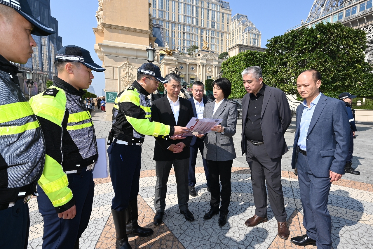 随着访澳旅客突破历史新高,加上多项除夕大型倒数活动即将举办,警方预计将吸引大量市民和旅客参与庆祝。为确保各项活动安全有序进行,警察总局局长梁文昌今日(29 日)上午率治安警察局代局长伍素萍、警察总局局长助理梁文照、局长助理魏瑞斌、治安警察局副局长梁庆康、代副局长郑俊禧等领导主管,先后实地视察大三巴、旅游塔、官也街、金光大道等主要活动场地及人流密集区域,检视节日安保工作的落实情况。
