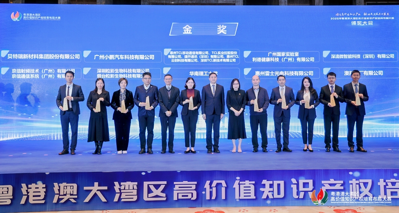 2025年粤港澳大湾区高价值知识产权培育布局大赛(下称“湾高赛”)颁奖大会今(20)日在惠州举行,广东省市场监督管理局(知识产权局)局长陈新烈、香港特别行政区政府知识产权署助理署长刘国强、澳门特别行政区政府经济及科技发展局副局长郑晓敏,以及惠州市人民政府副市长曲维震等嘉宾出席大会。