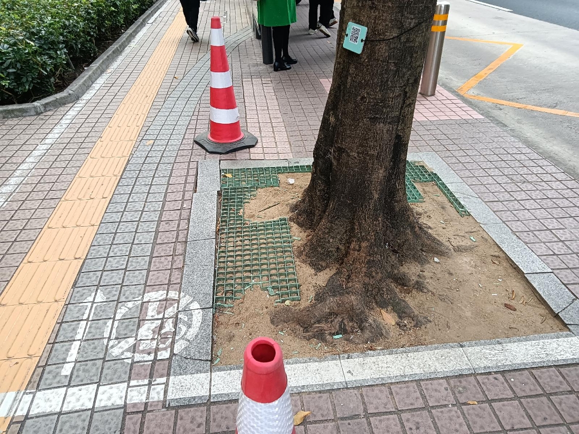 过去使用的树穴格栅有防止土壤板结及保护树根的作用,但镂空结构易积存烟头、纸屑、小石、细小垃圾甚至动物粪便,增加清洁难度。另外,因风雨冲洗及树根生长,格栅可能会出现凸起、脆化、边缘翘起等情况,影响行人及轮椅和婴儿车的通行。