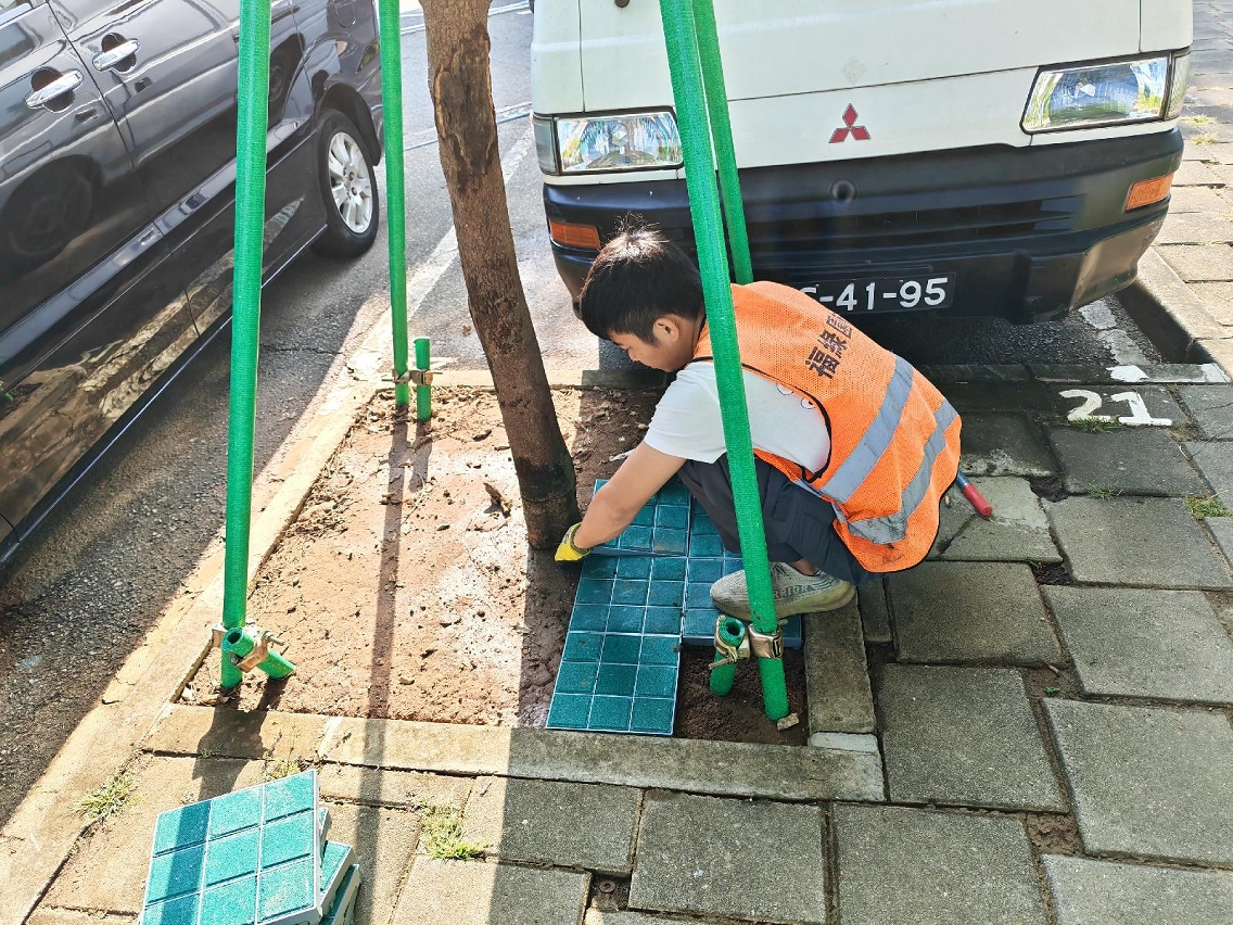 • 工作人员对树穴换上新型疏水透气材质铺面