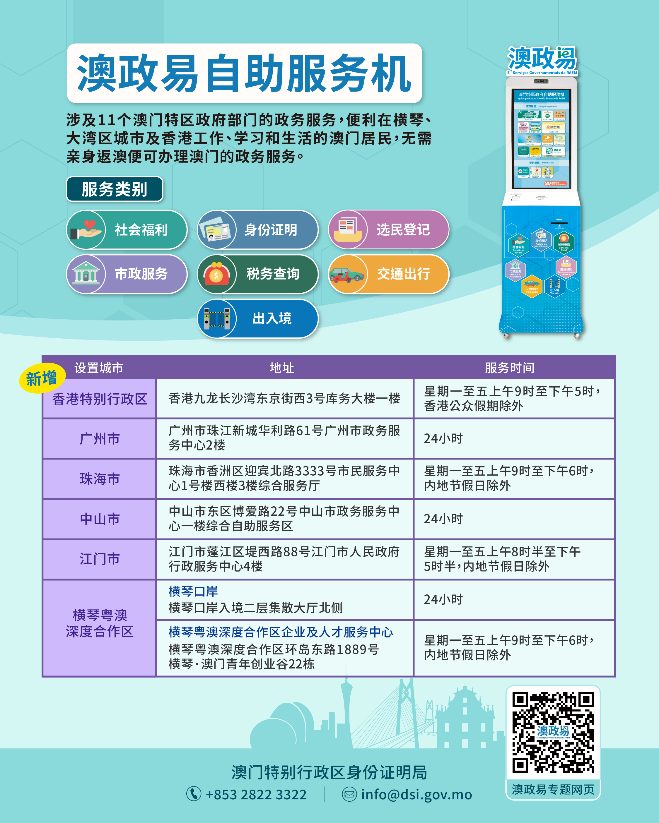 有关“澳政易”自助服务机的详情,请参阅相关专题网页:https://www.dsi.gov.mo/mo-eservice/。