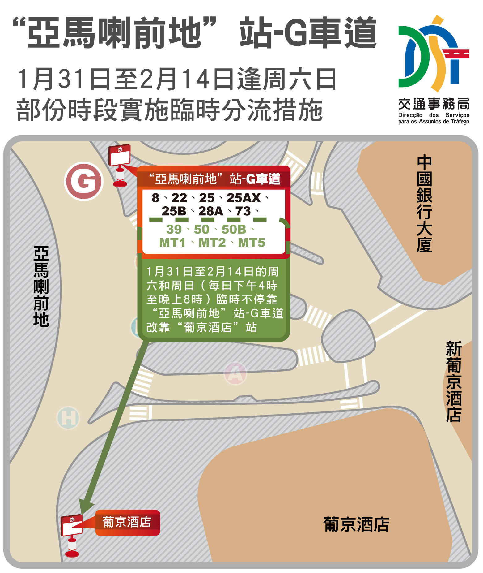为应对农历新年前客流增多的情况,“亚马喇前地”站-G车道的部份巴士路线于1月31日至2月14日的周六和周日(每日下午4时至晚上8时)改靠“葡京酒店”站(具体可查询以下附表)。交通事务局已指示两巴增派人员及增加临时指示,以提示乘客有关安排,并会留意客流情况,适时增加班次。