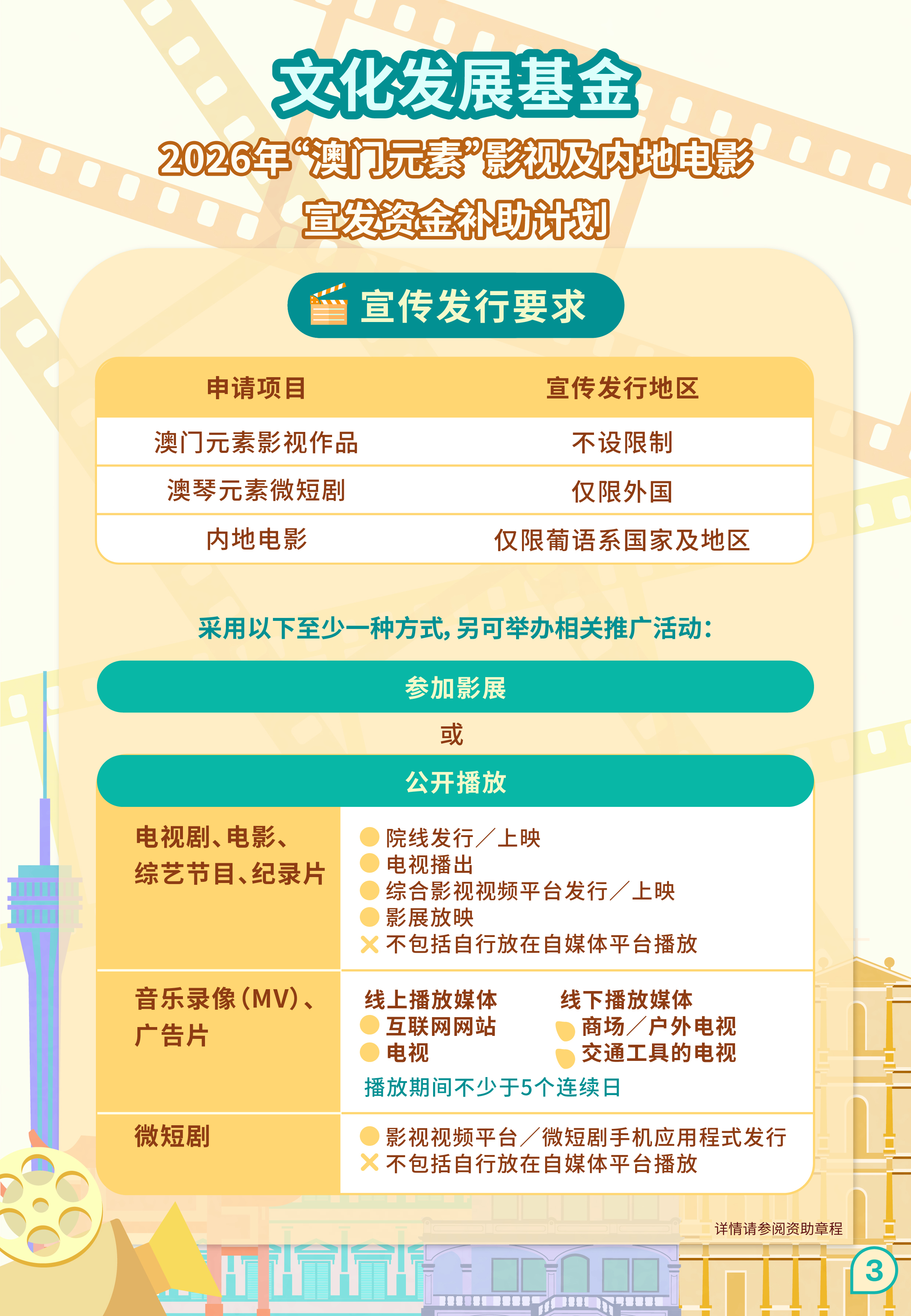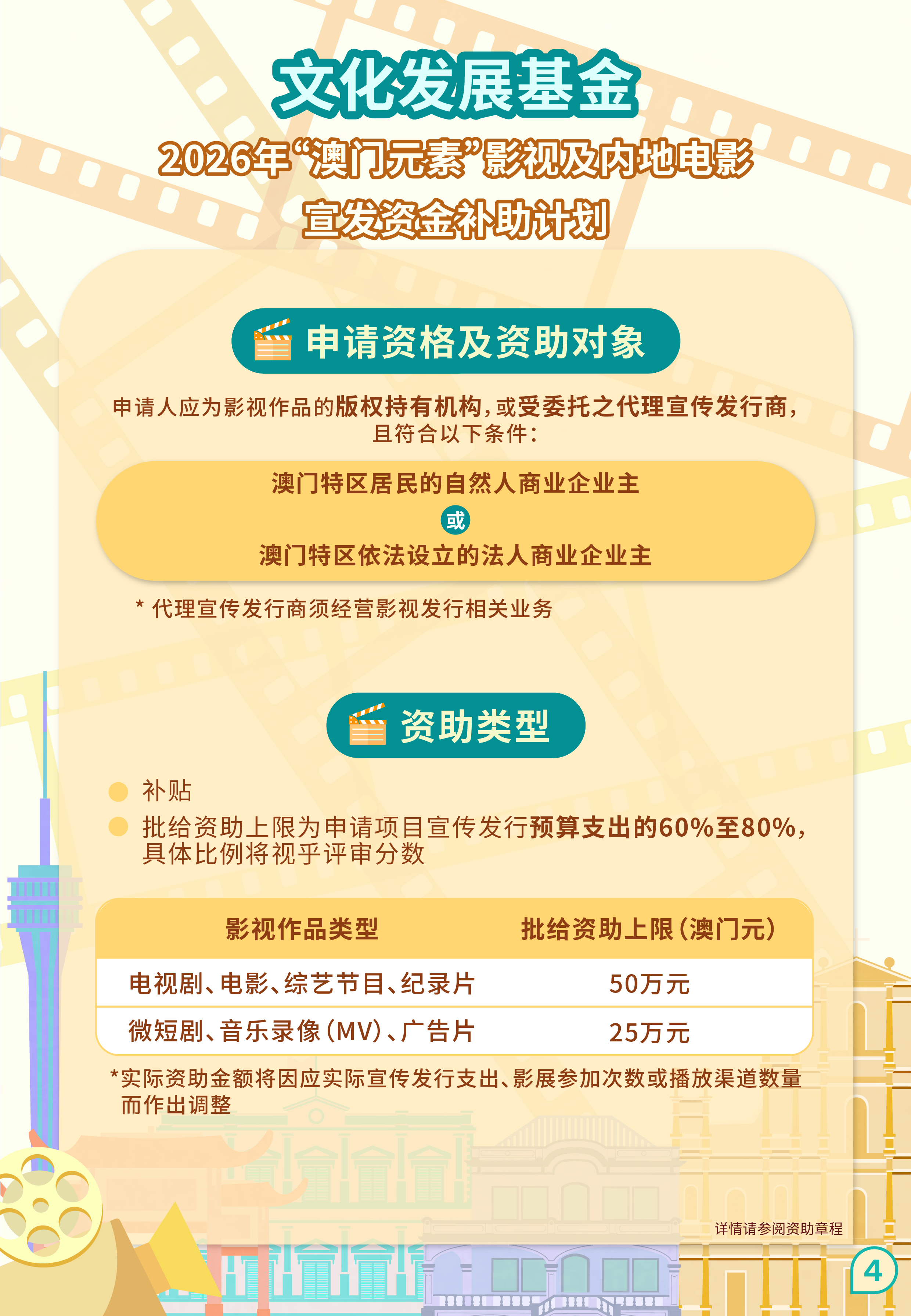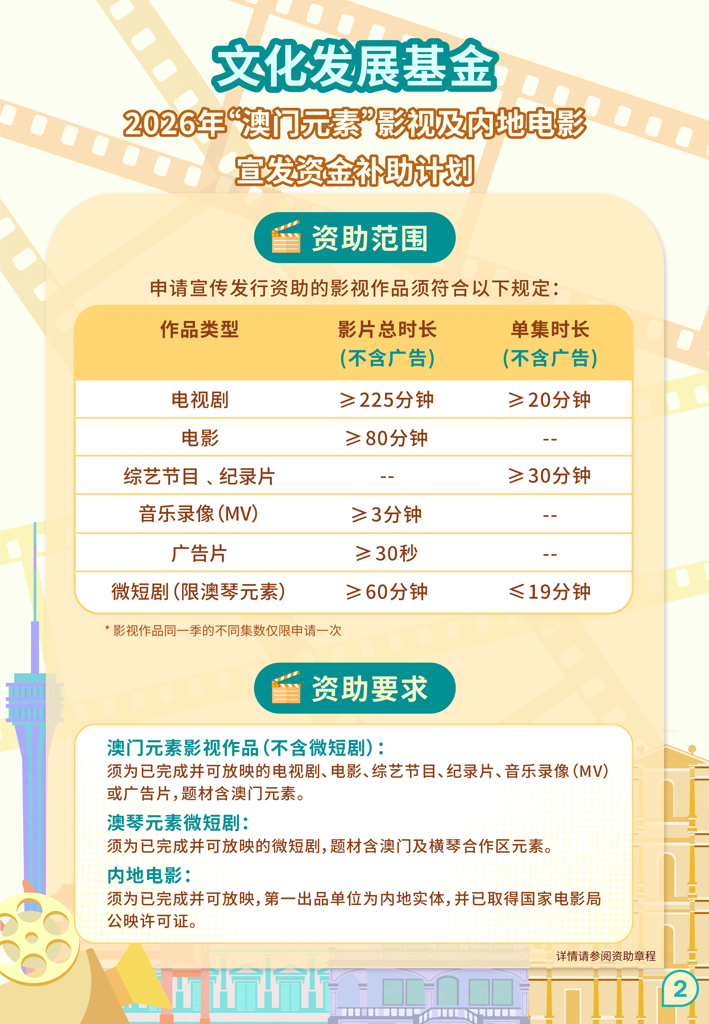 宣传发行资助亦优化为“澳门元素”影视及内地电影宣发资金补助计划。申请人须为澳门依法设立及运作的商业企业主,并为版权持有机构或受委托的代理宣传发行商。除继续支持具澳门元素的影视作品在各地宣传发行外,资助范围将扩展至具澳琴元素的微短剧在海外推广,以及已取得国家电影局公映许可证的内地电影在葡语系国家和地区的宣传发行。整项资助计划总预算为500万澳门元,其中具澳琴元素的微短剧预算为150万澳门元。资助上限均为宣发预算支出的60%至80%。所有申请项目须为已完成摄制并可放映的影视作品。
