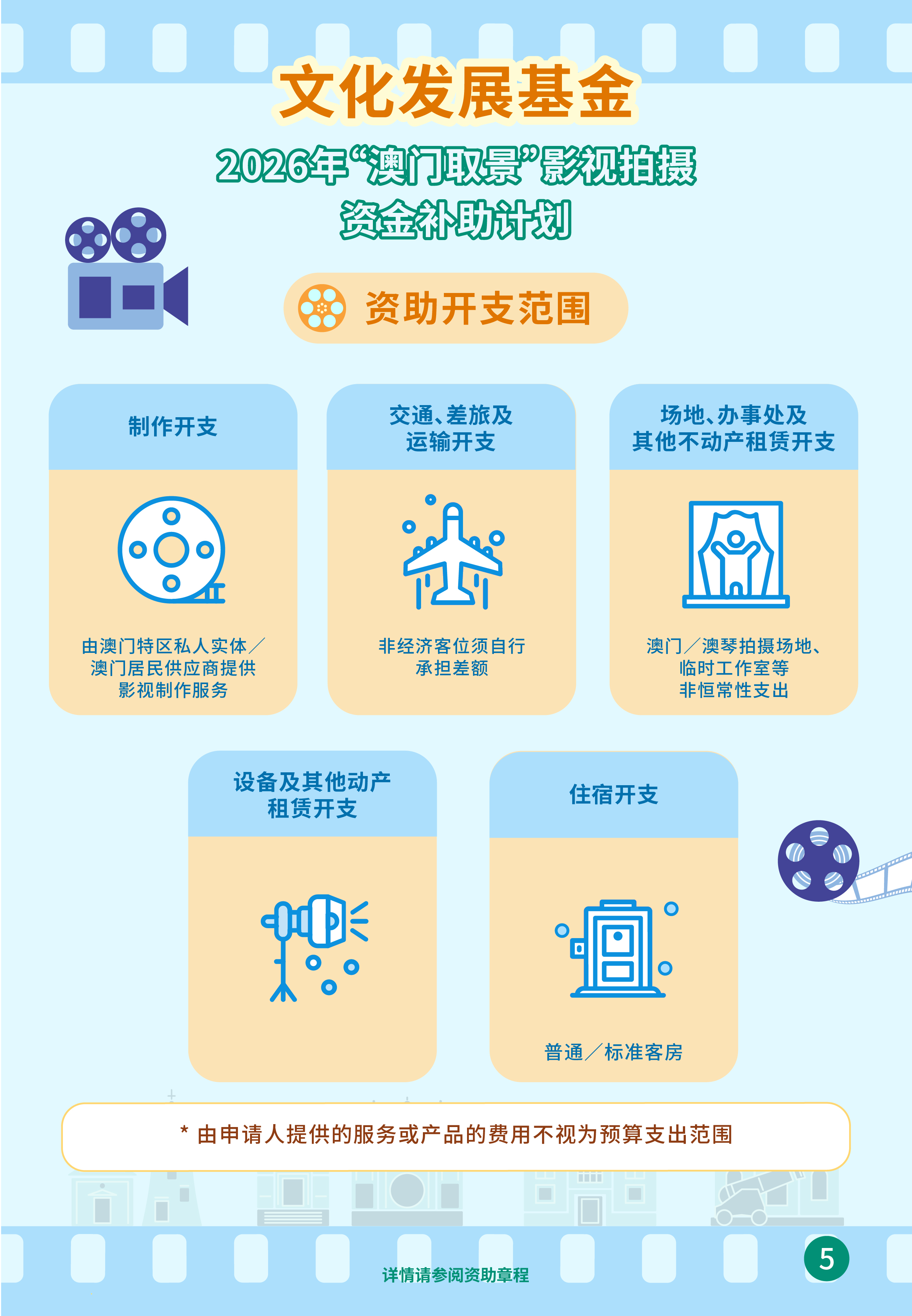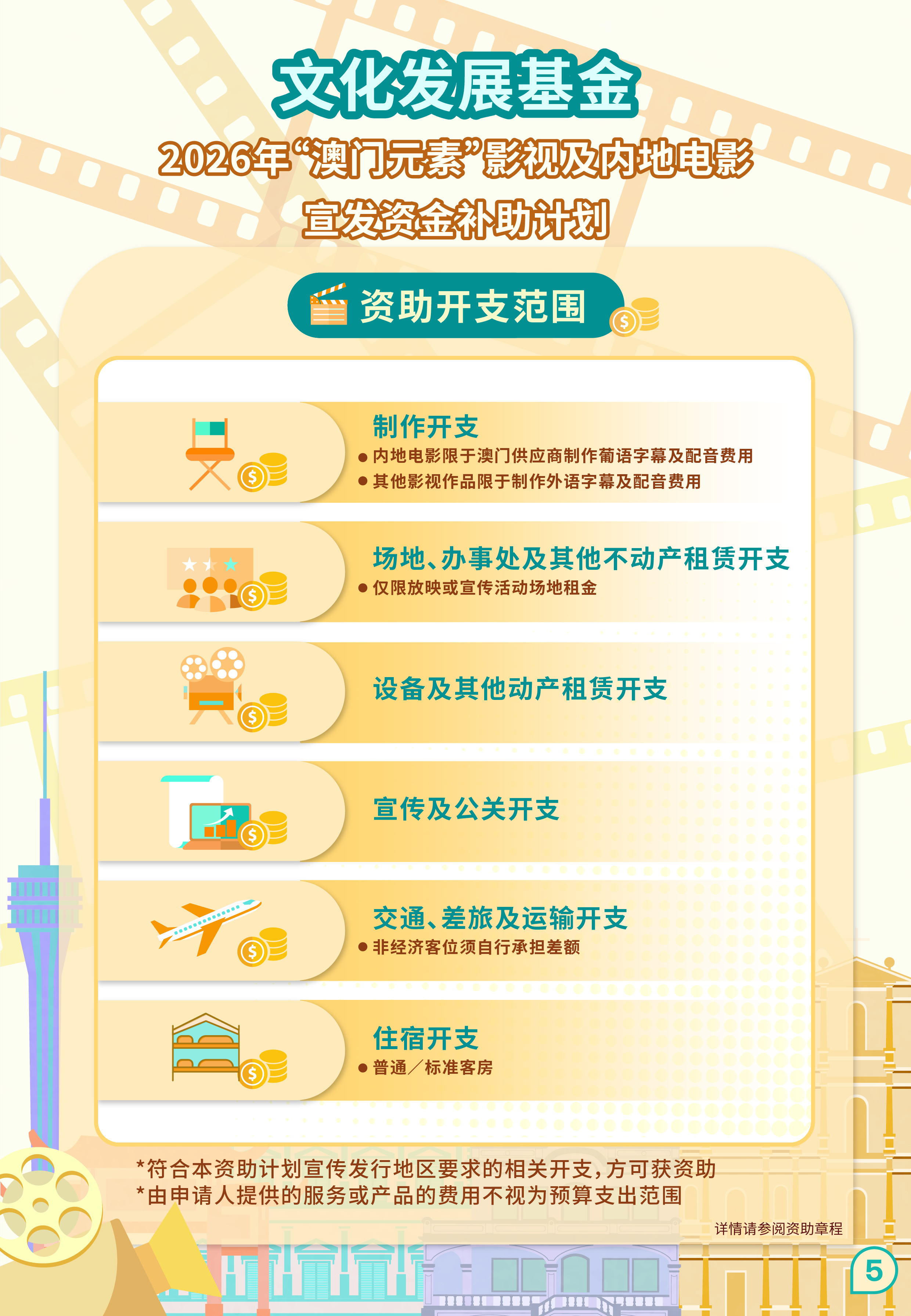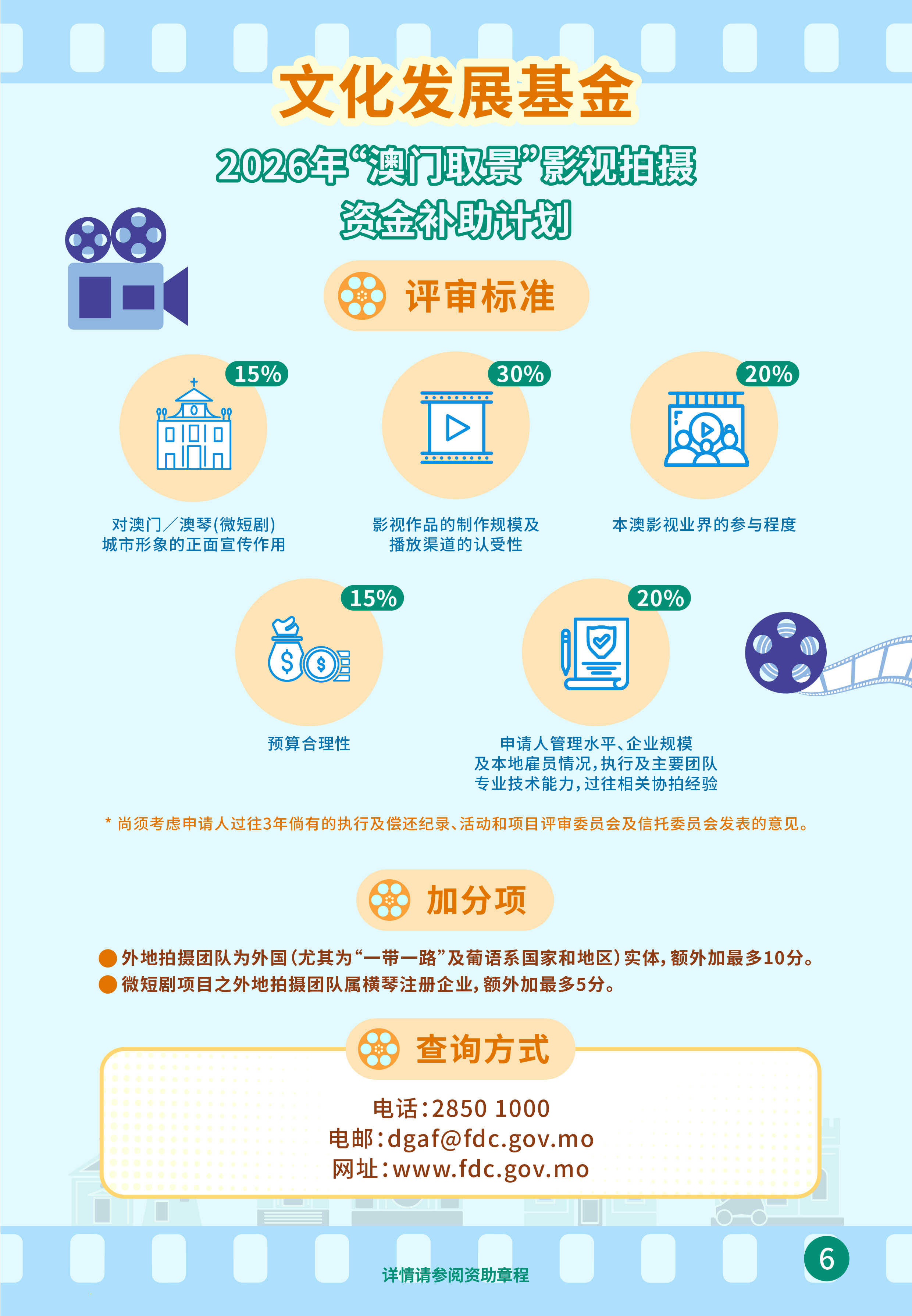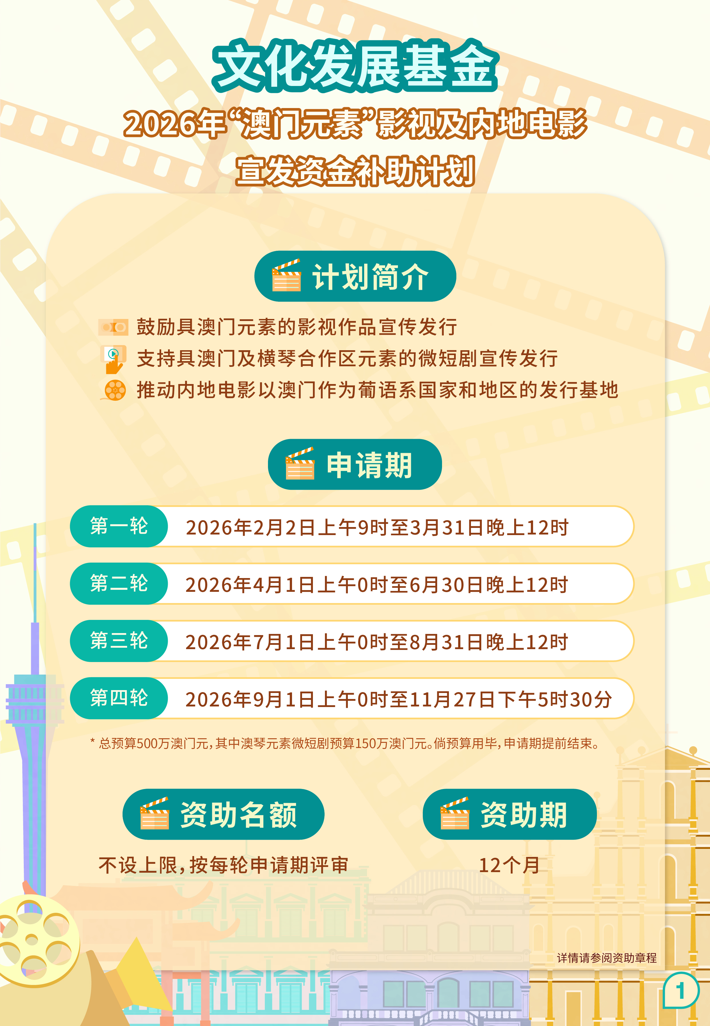 文化发展基金于2026年持续推动澳门影视产业,优化“澳门元素”及“澳门取景”两项资金补助计划,进一步鼓励具澳门及横琴粤澳深度合作区元素的微短剧拍摄与宣传发行,同时支持内地电影以澳门作为葡语系国家和地区的发行基地,发挥澳门作为文化交流桥梁的作用。