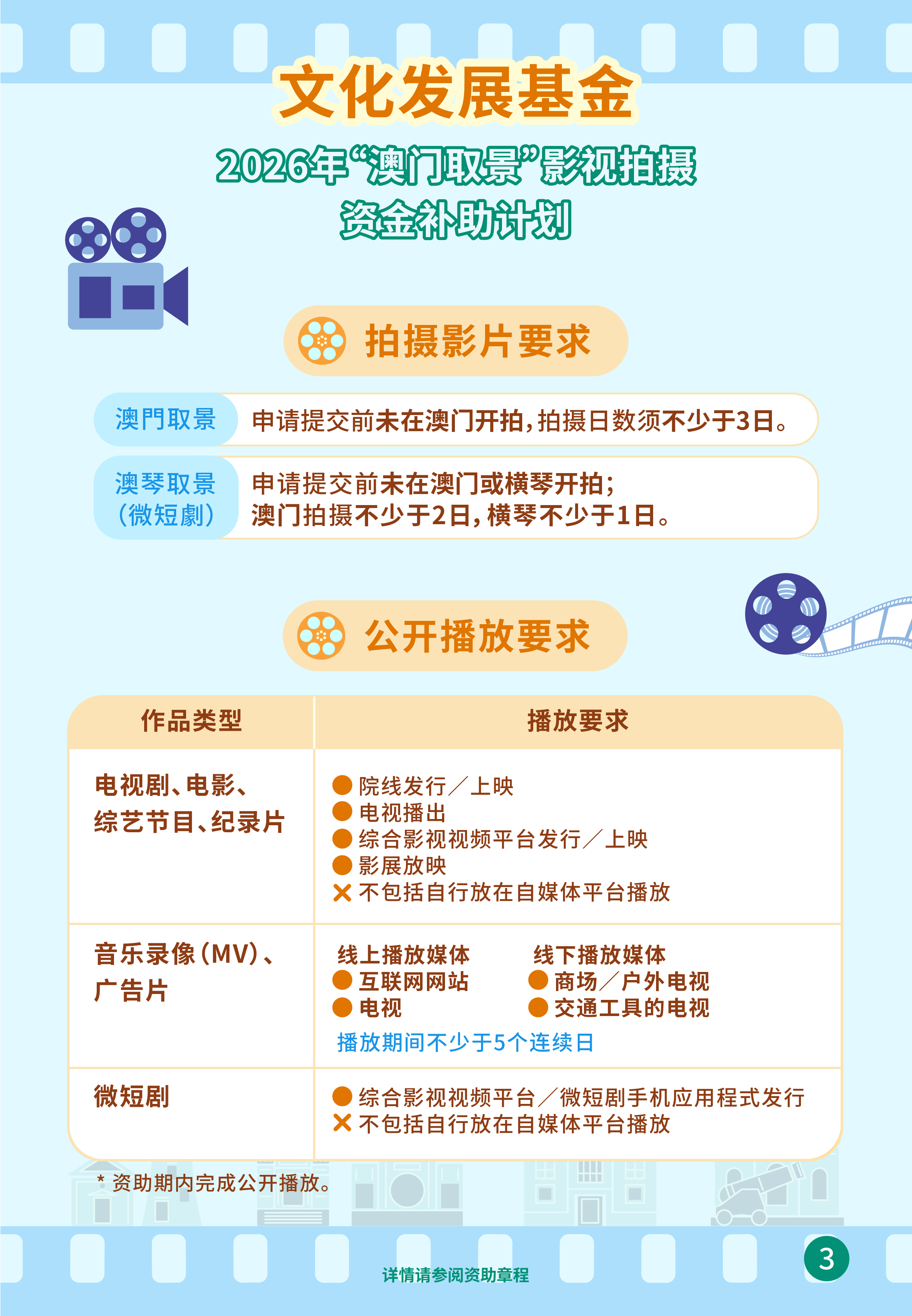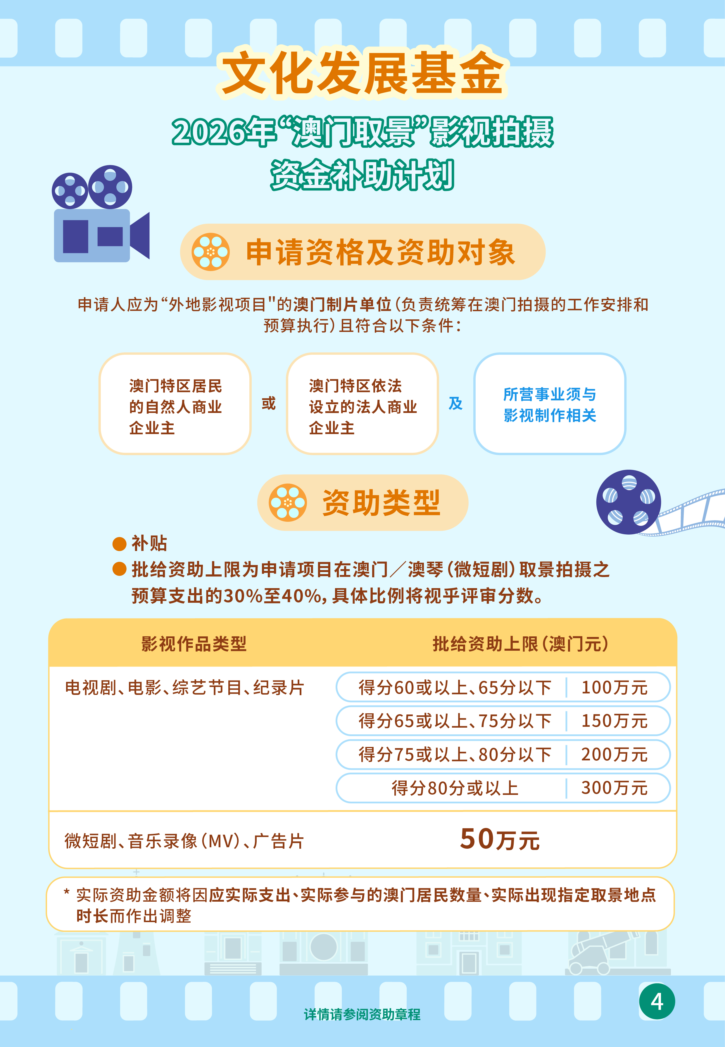 “澳门取景"影视拍摄资金补助计划的申请人须为澳门依法设立及运作的商业企业主,并作为外地影视项目的澳门制片单位。为配合“澳琴共建微短剧拍摄出海基地”建设,2026年新增接受在澳门及横琴合作区实地取景拍摄的微短剧项目申请。整项资助计划总预算为3,000万澳门元,其中微短剧预算为500万澳门元。资助上限为拍摄预算支出的30%至40%。申请项目须在确认提交申请前,尚未在澳门或澳琴展开拍摄取景工作。