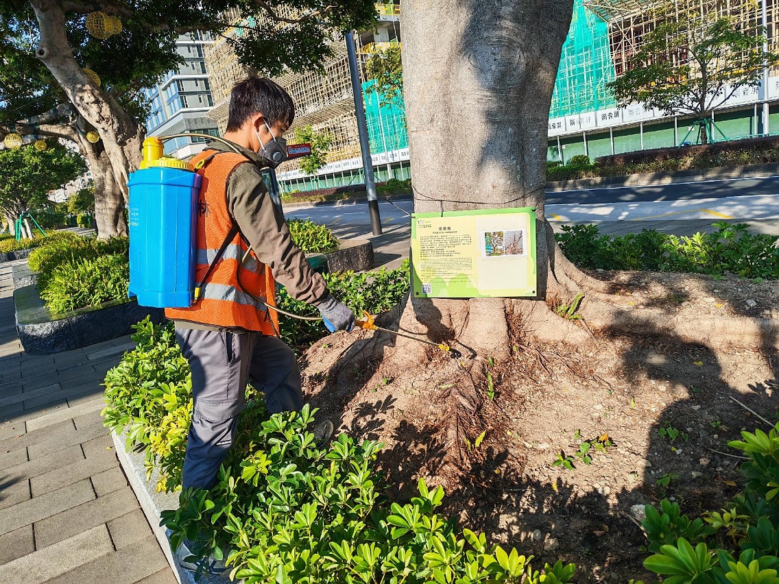 市政署持续巡查及护理各区街道树木,以维护树木健康及公众安全。树木养护人员经巡查发现观音像海滨休憩区两株榕树感染褐根病,正持续进行救治并已挂上告示牌,让市民知悉树木状况。
