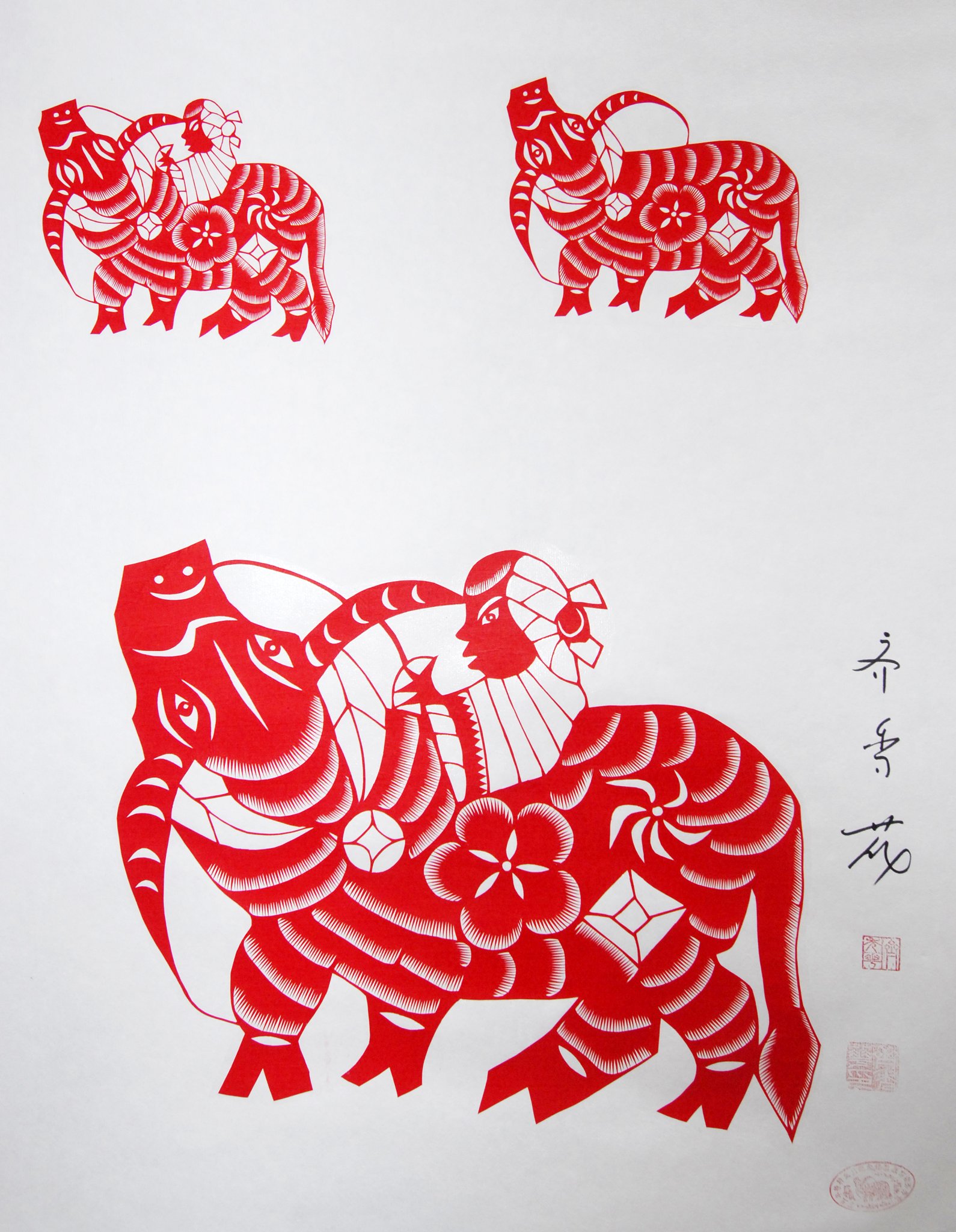 高密剪紙第十六代傳承人齊秀花,為山東省首批民間文化傑出傳承人及省級手工藝製作大師,並創立“齊秀花剪紙研究所”,作品《金牛奮蹄》被中國郵政部選為丁丑年(一九九七年)生肖紀念郵票。是次來澳帶來佳作眾多,除《金牛奮蹄》外,還有《福祿壽囍》、《女十忙》、《十二生肖》等多幅大型剪紙代表作。